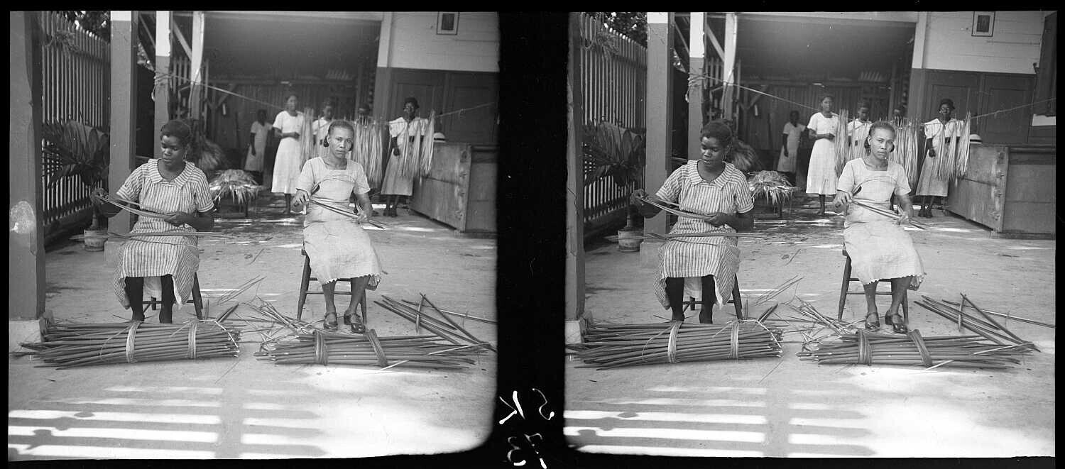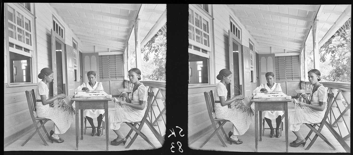 Links het weven van een hoed, in het midden het bord...