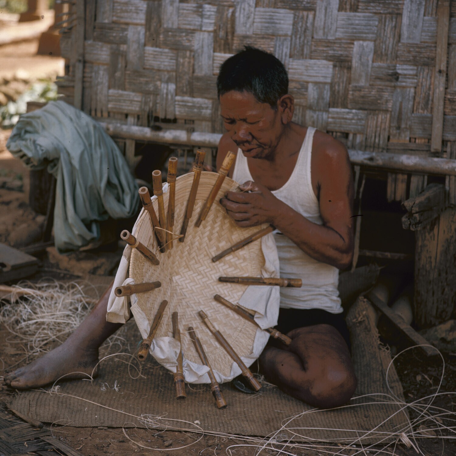 Een leprapatient vlecht een hoed. Lepradorp bij Rant...