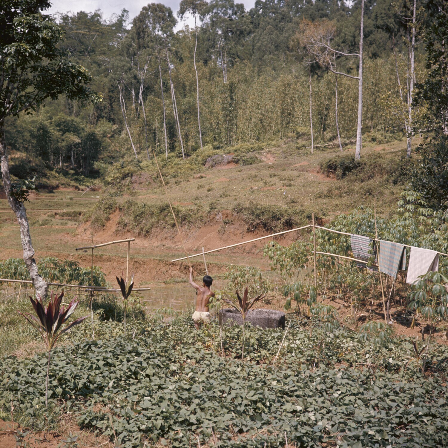 Lepradorp bij Rante Pao, Sulawesi. Waterputtende man
