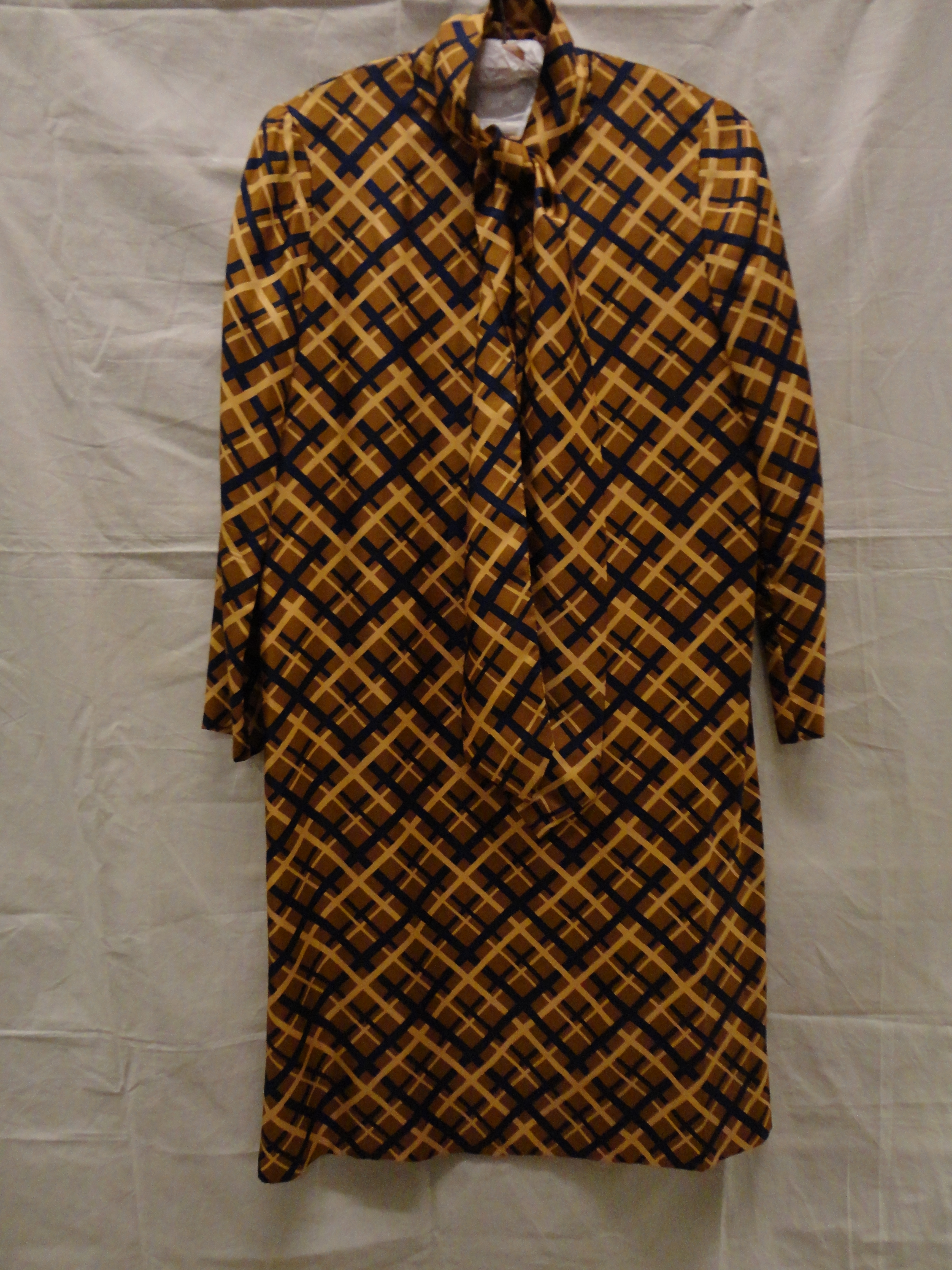 Jurk van zijde, bruin fond bedrukt met beige en blau...