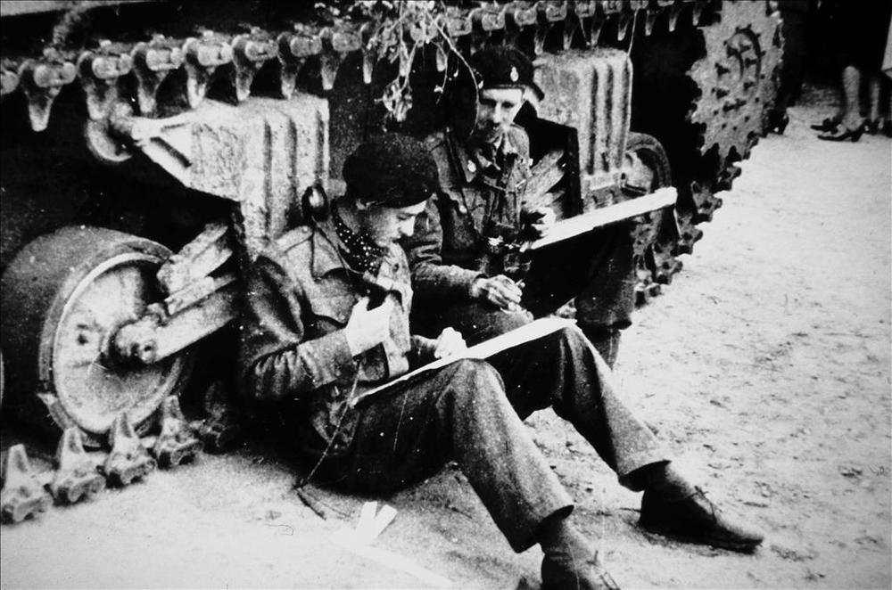 Foto van Canadese of Engelse soldaten in het kapotge...
