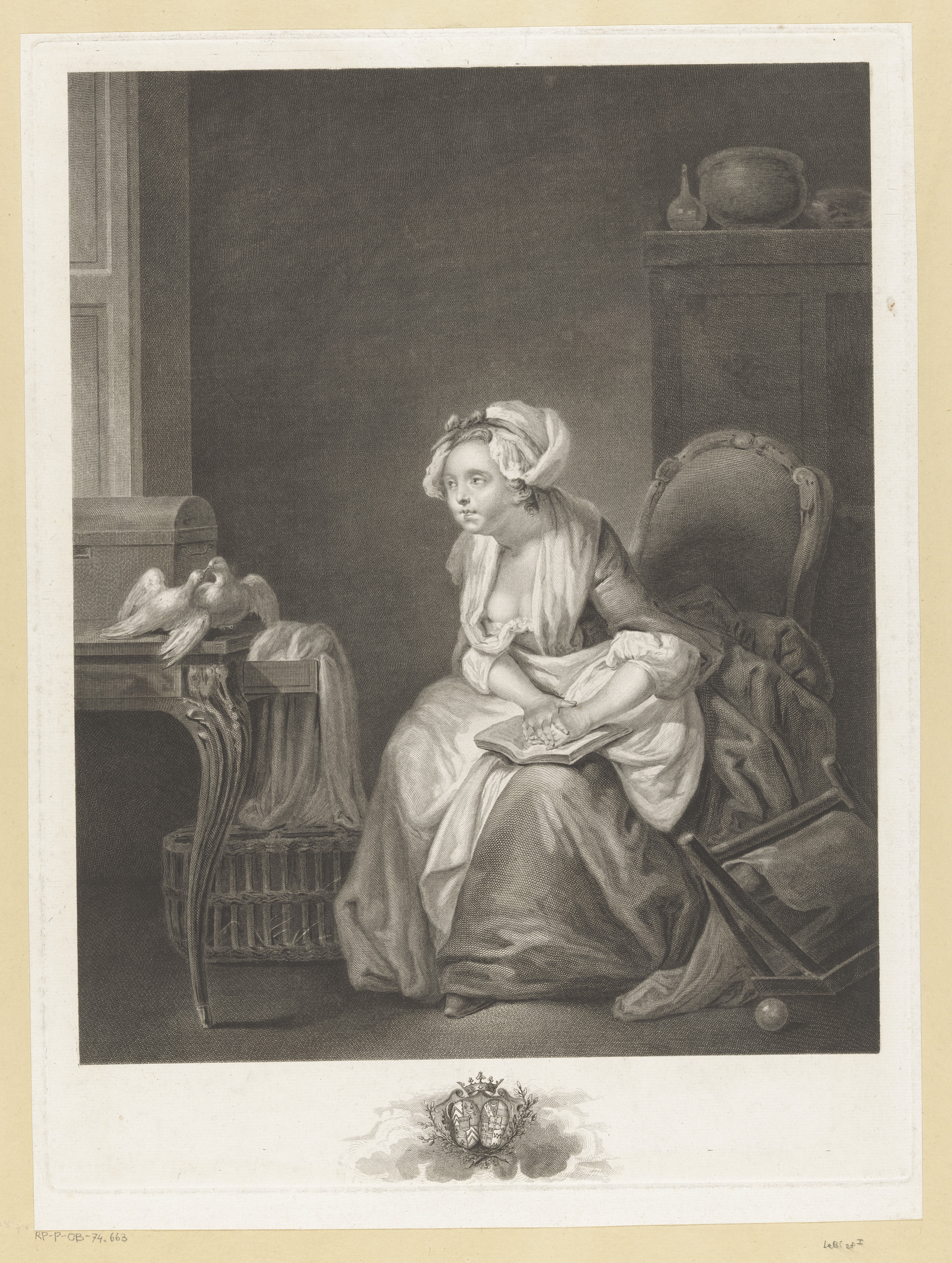 Interieur met een jonge vrouw, zittend op een stoel,...