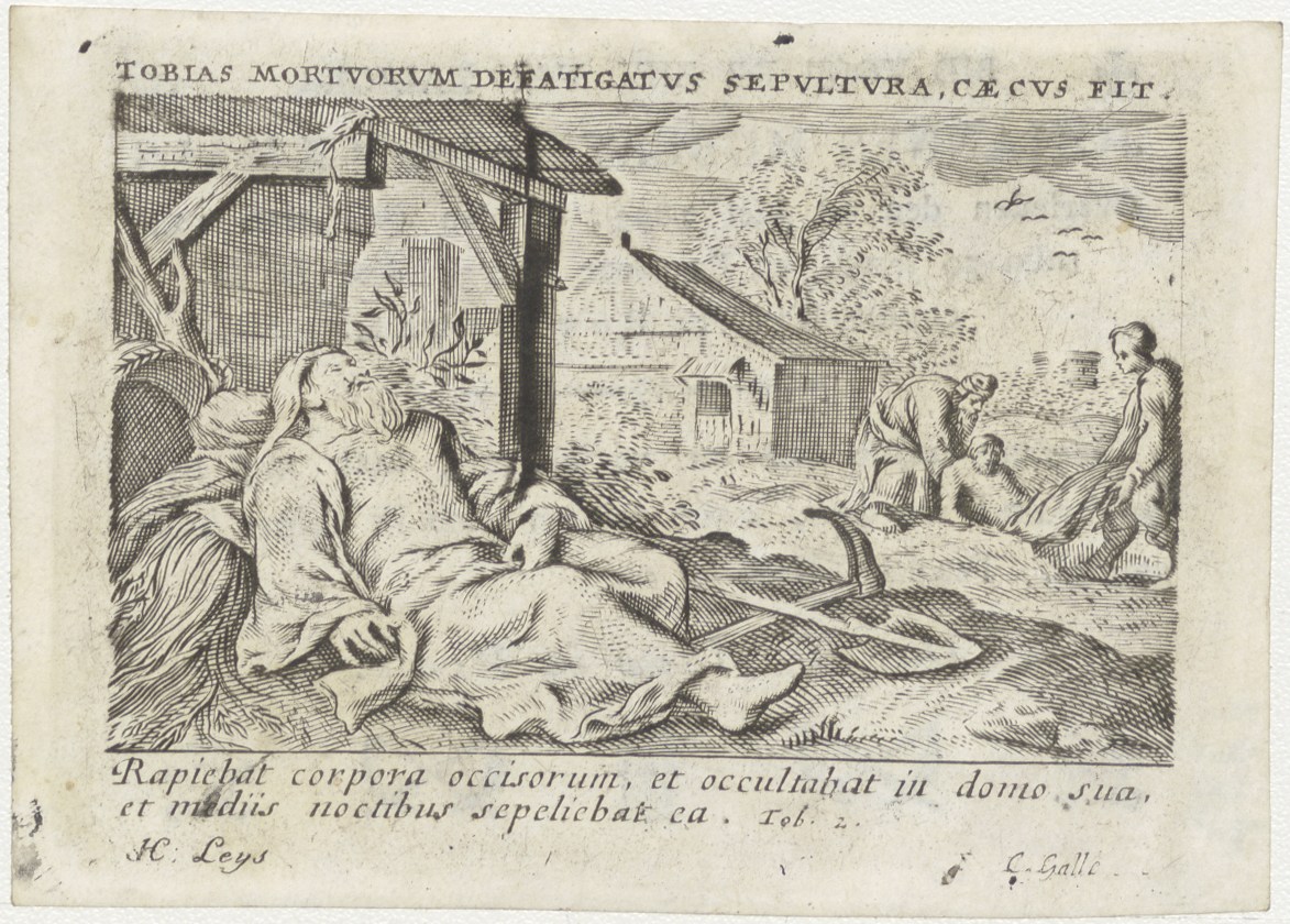 Tobias wordt blind, op de achtergrond begraaft hij d...