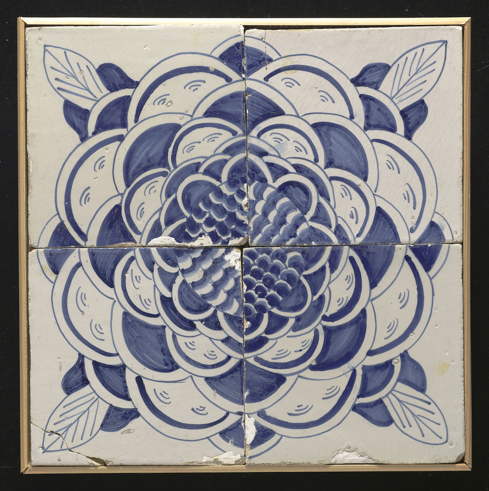 Tegelveld in tinglazuur, voorstellende kwartrozet me...