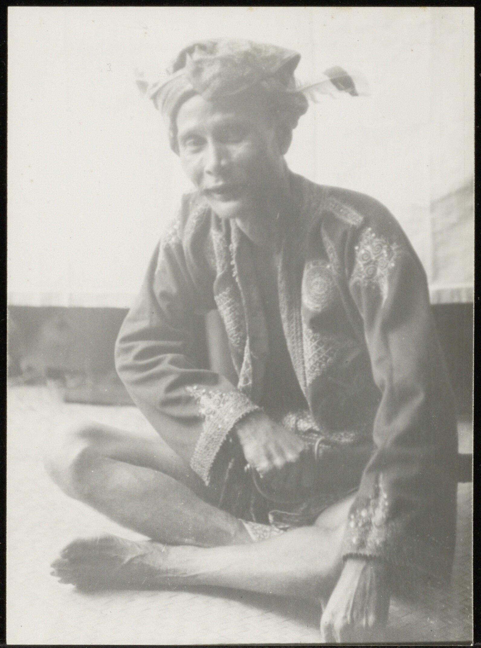Portret van een Dayak met hoofddoek en opengedragen ...
