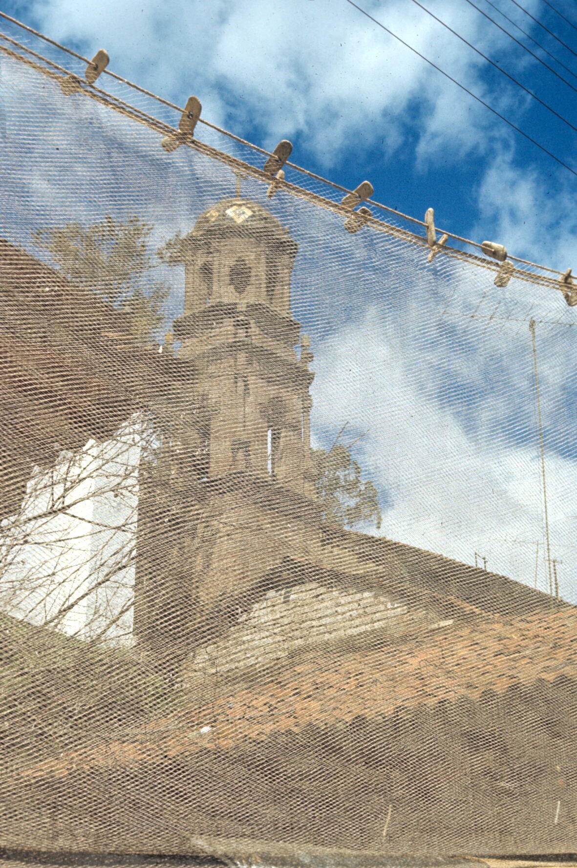 gezicht op kerktoren opgenomen door opgehangen visne...