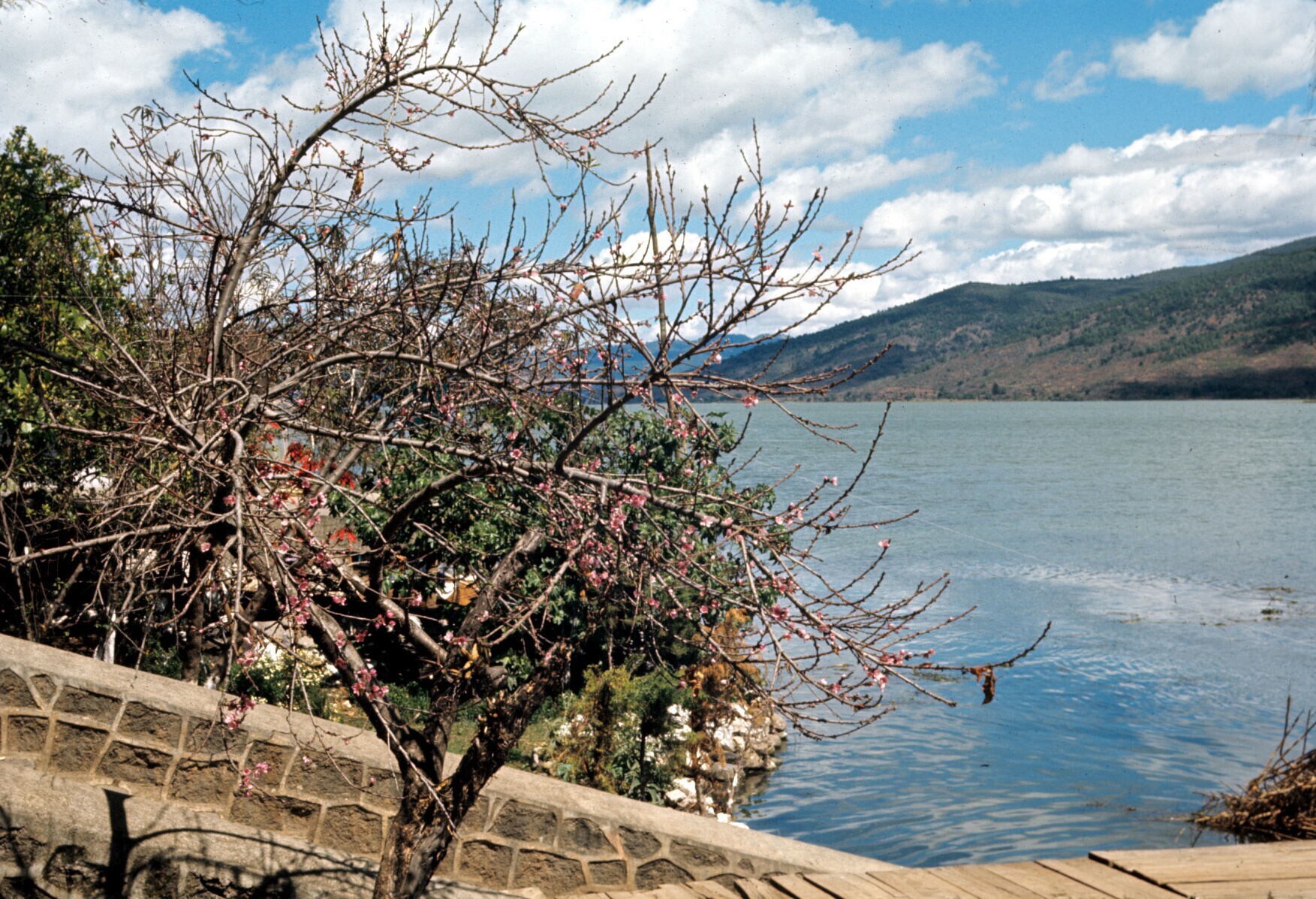 gezicht op het meer van Pátzcuaro; bloeiend boompje ...