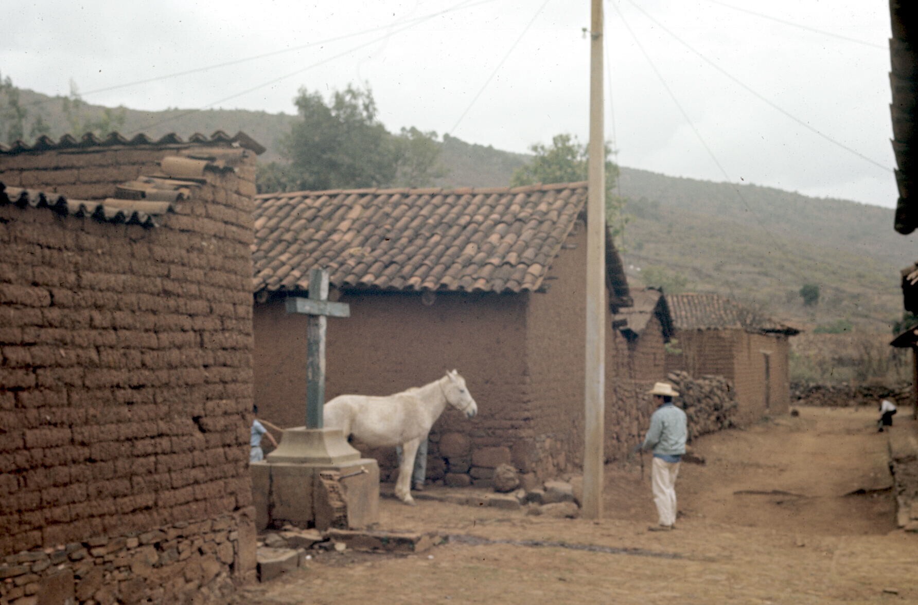 man en paard op[ kruispunt in dorp