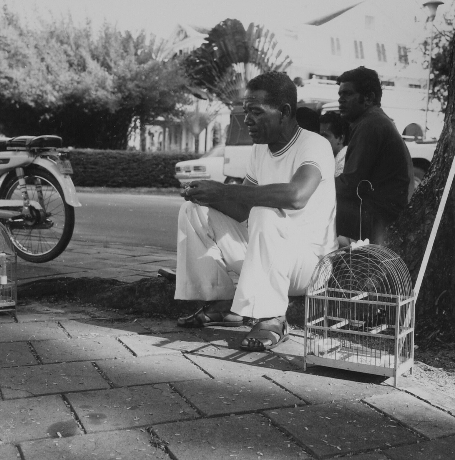 Eigenaar met zijn zangvogel de Twa-Twa,op de vreemds...