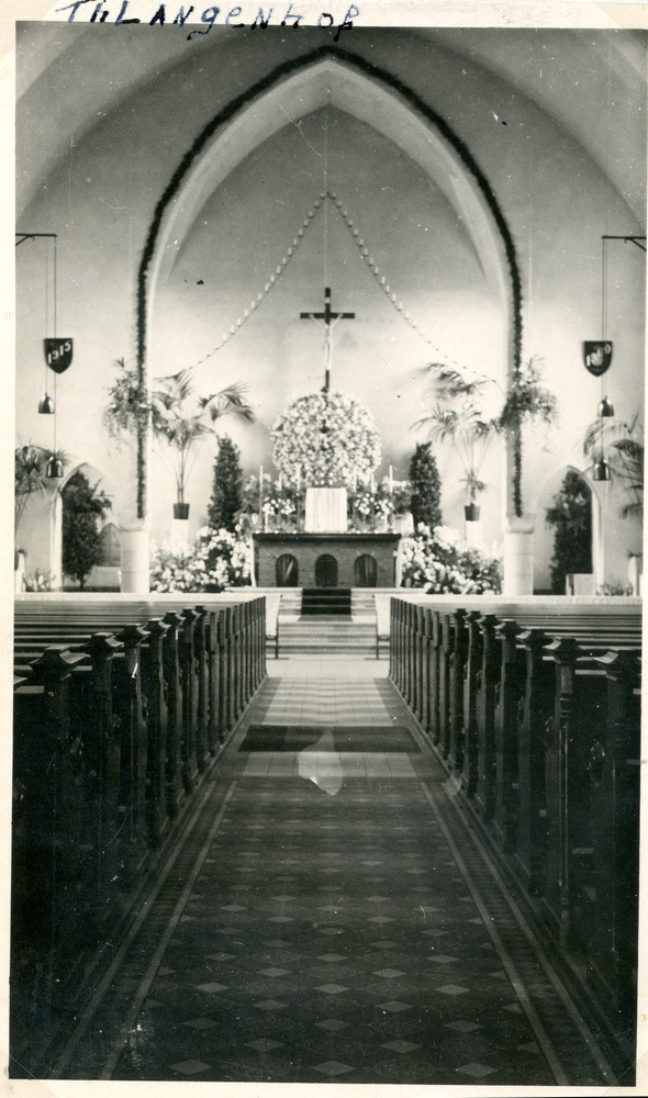 Zwart-wit foto van het interieur van de Rooms-Kathol...