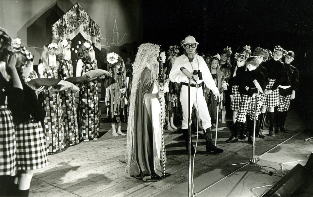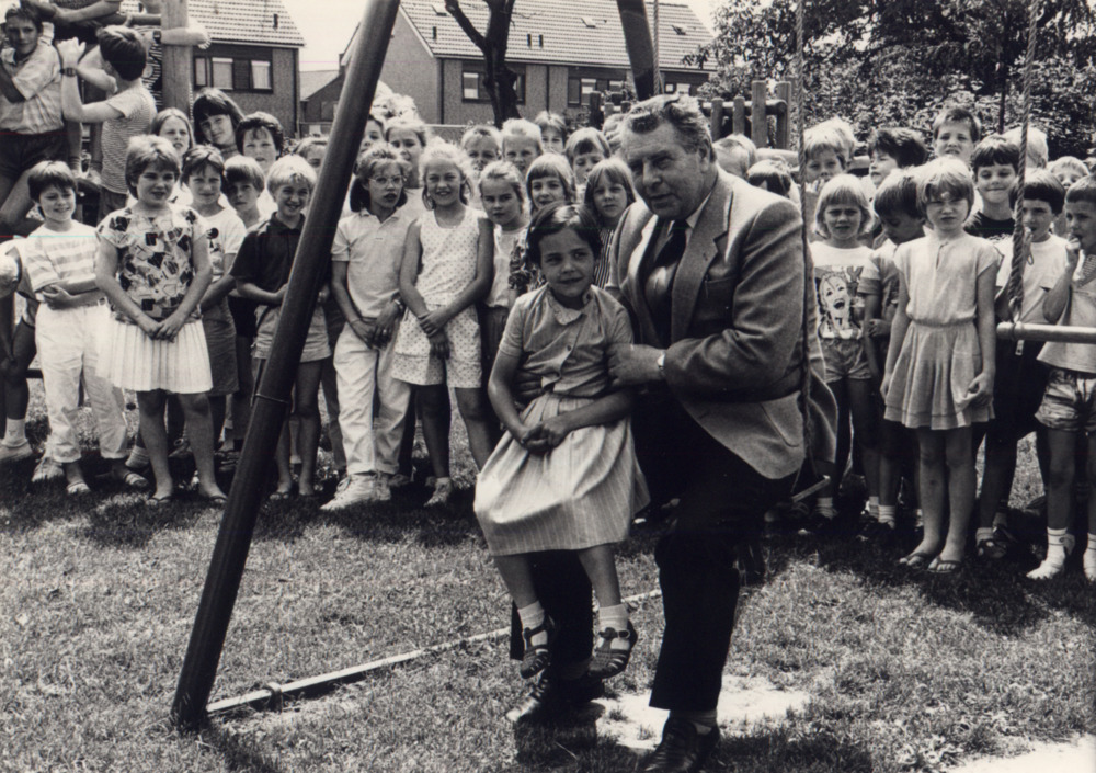 Zwart-wit foto van de opening van de speelplaats in ...
