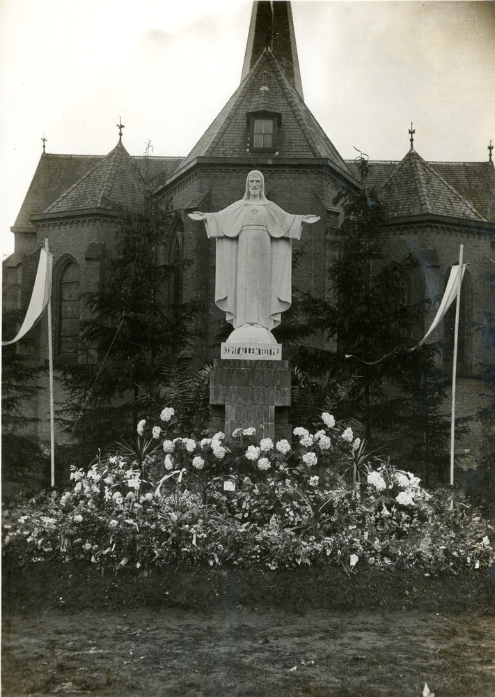 Zwart-wit foto van het versierde Christusbeeld achte...