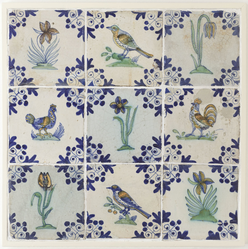 Tegelveld van keramiek, tinglazuur, voorstellende vo...