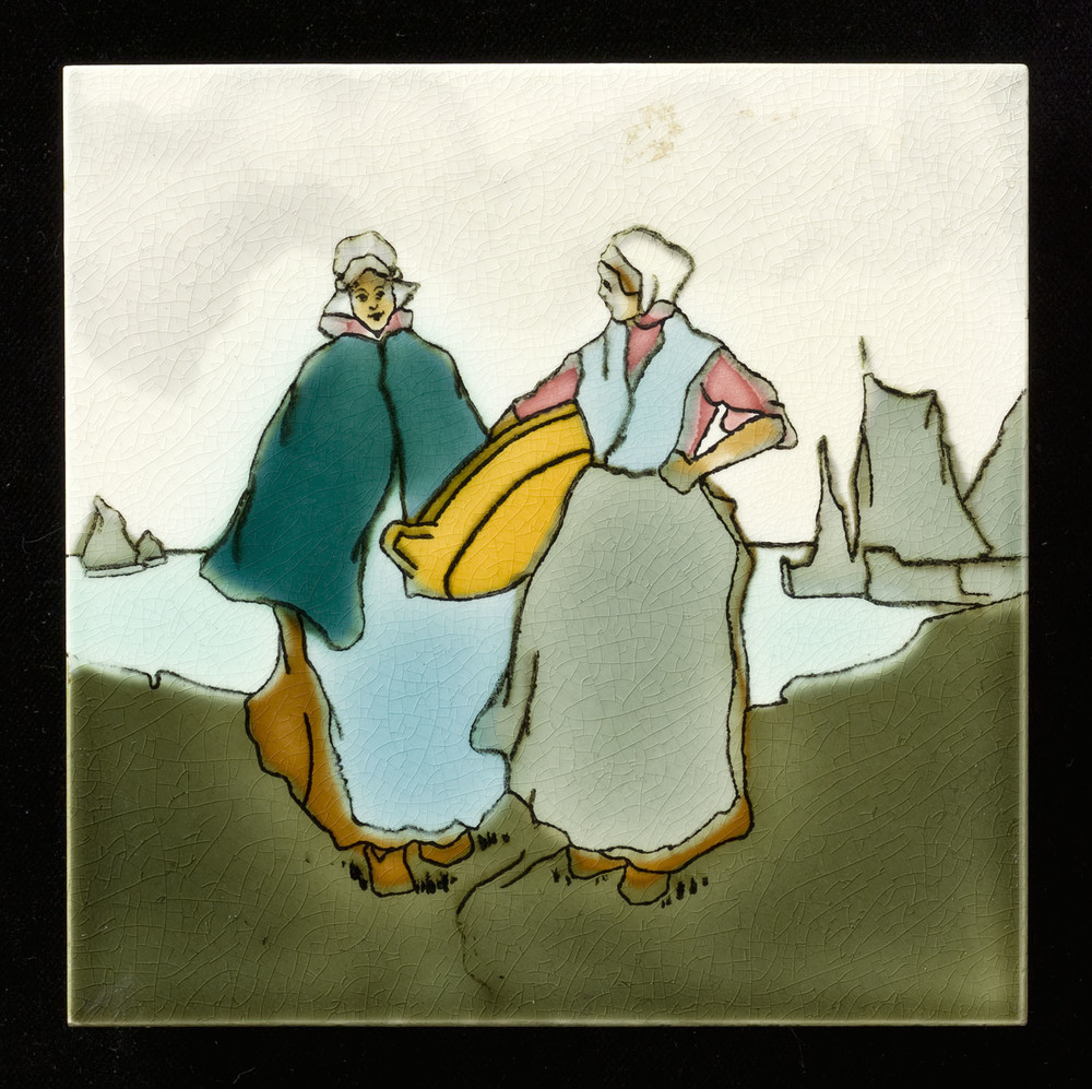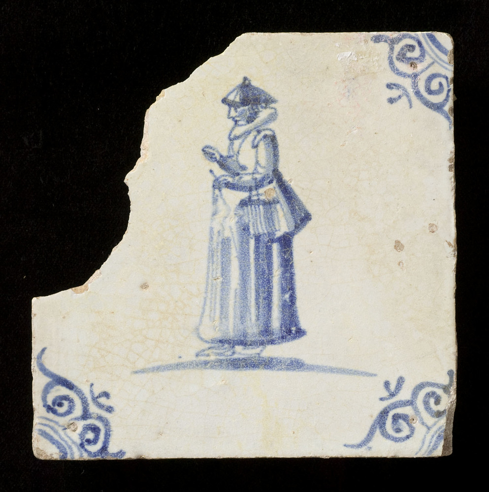 Tegel in tinglazuur, voorstellende vrouw met hoed, s...