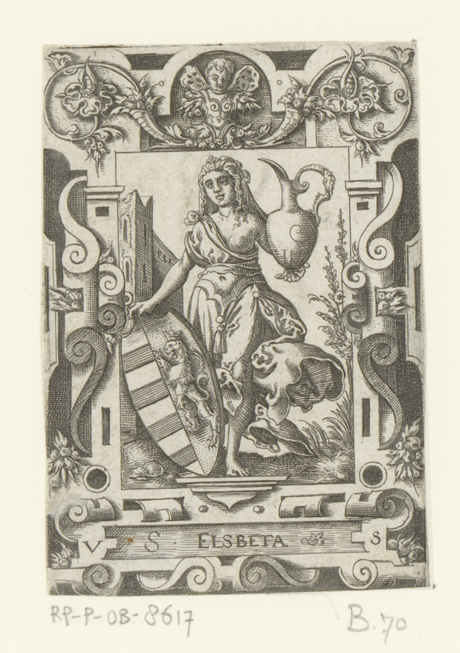 Elisabeth van Hongarije met wapenschild in rolwerk o...