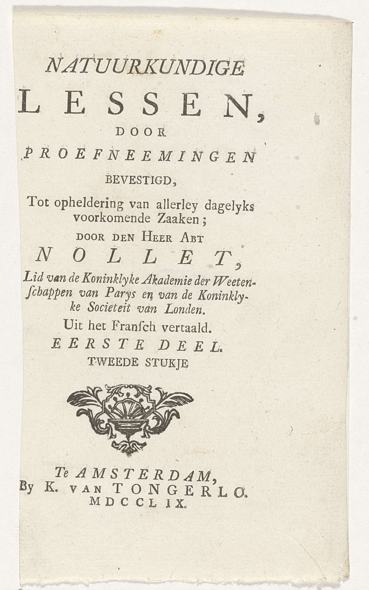 Titelpagina voor: J. A. Nollet, Natuurkundige lessen...
