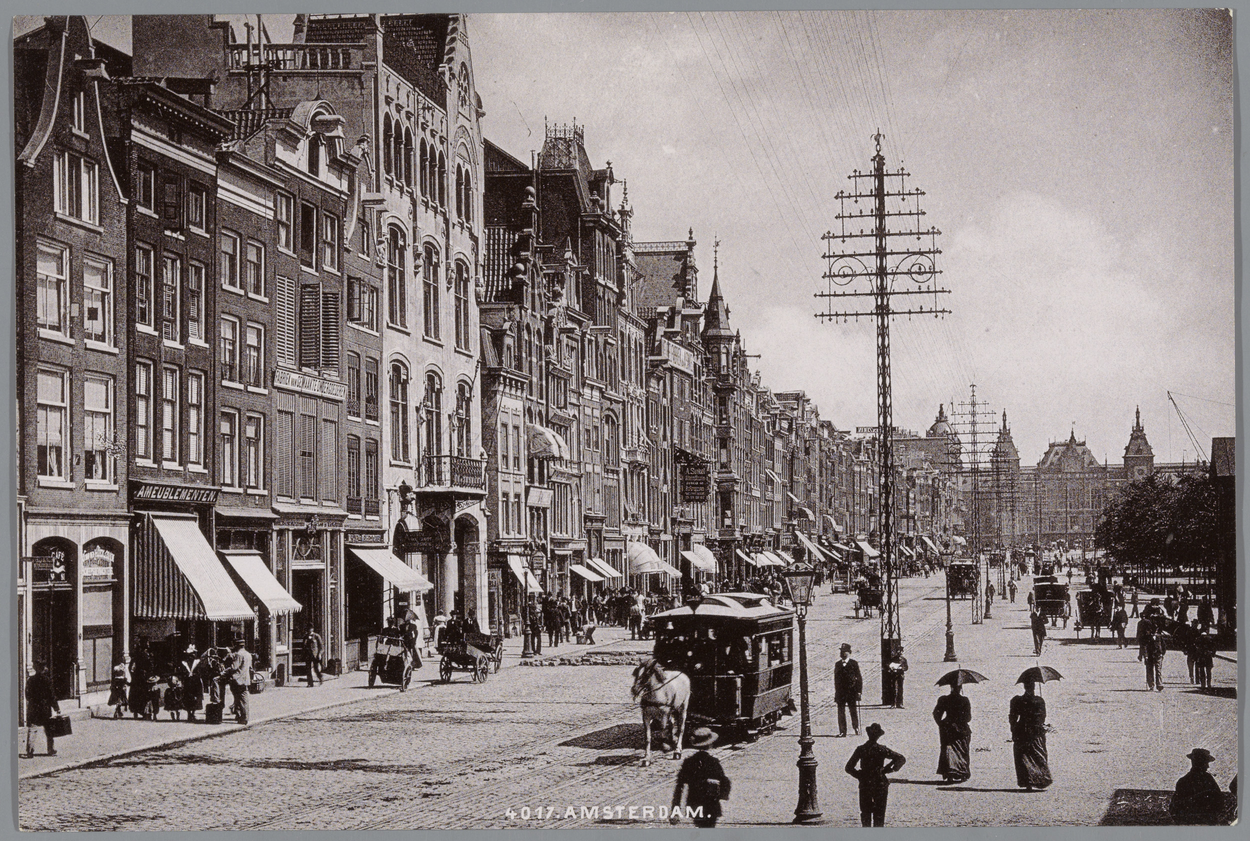 Gezicht op het Damrak in Amsterdam, met op de achter...