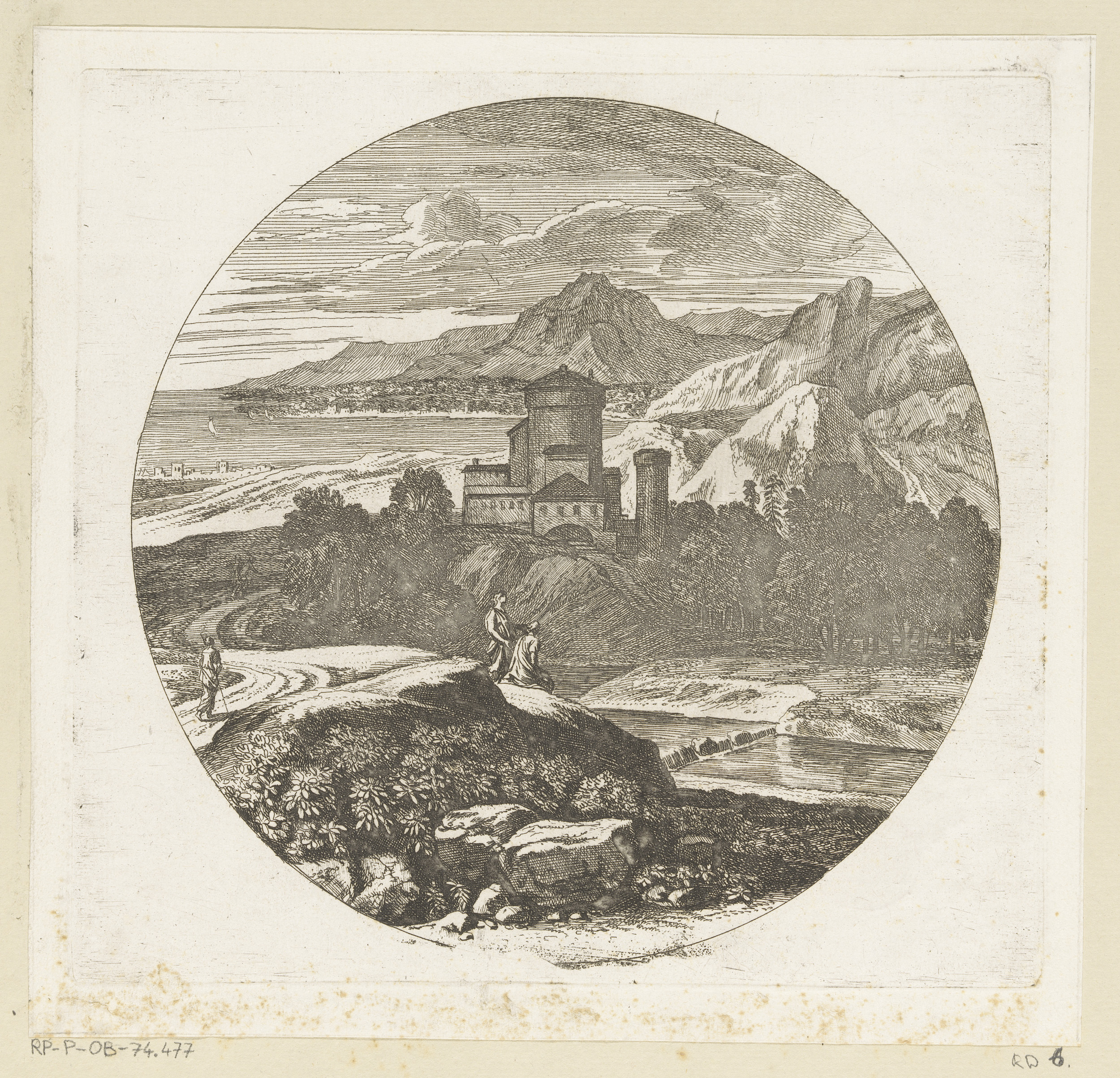 Arcadisch landschap met figuren op een voetpad tijde...