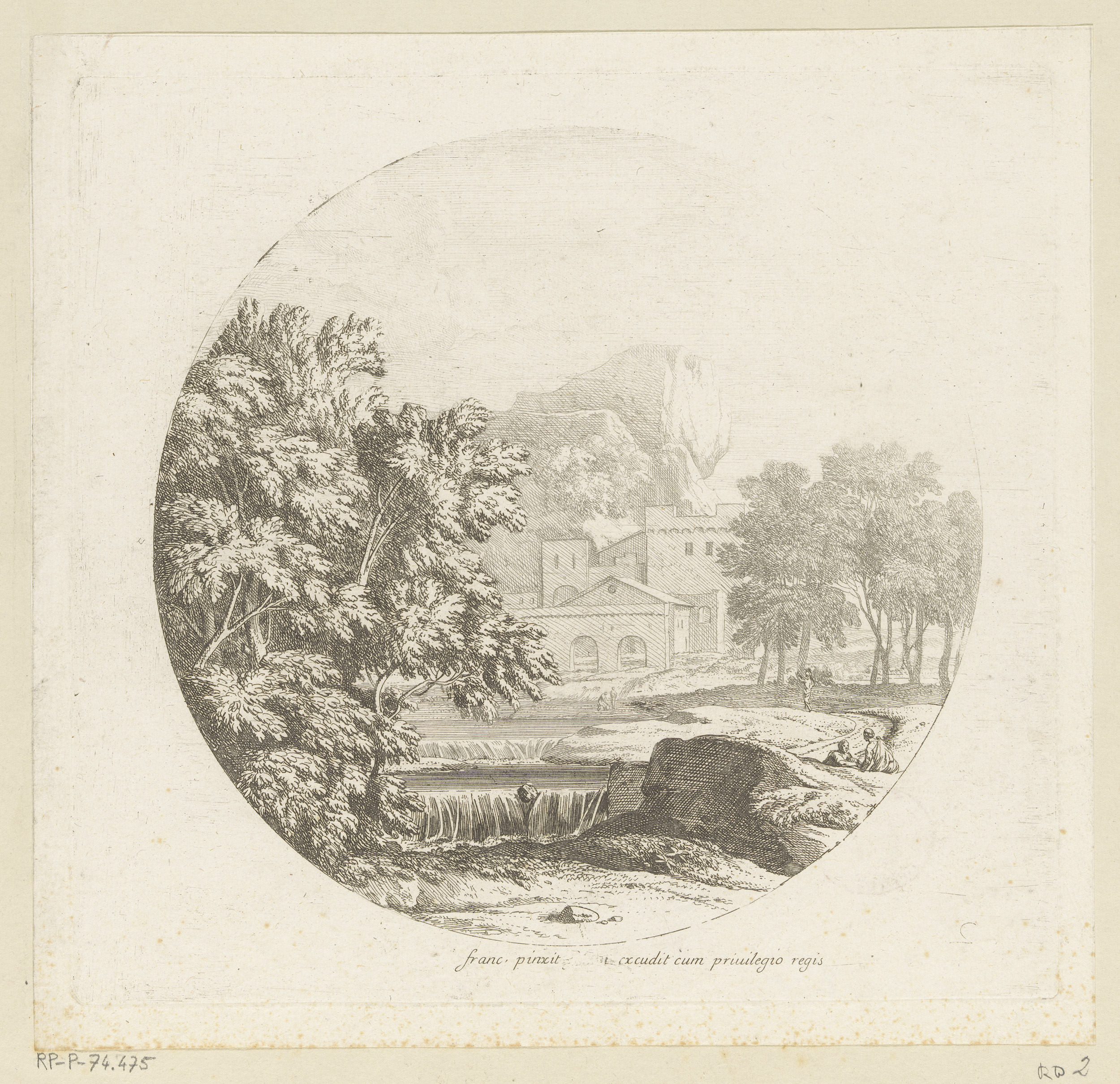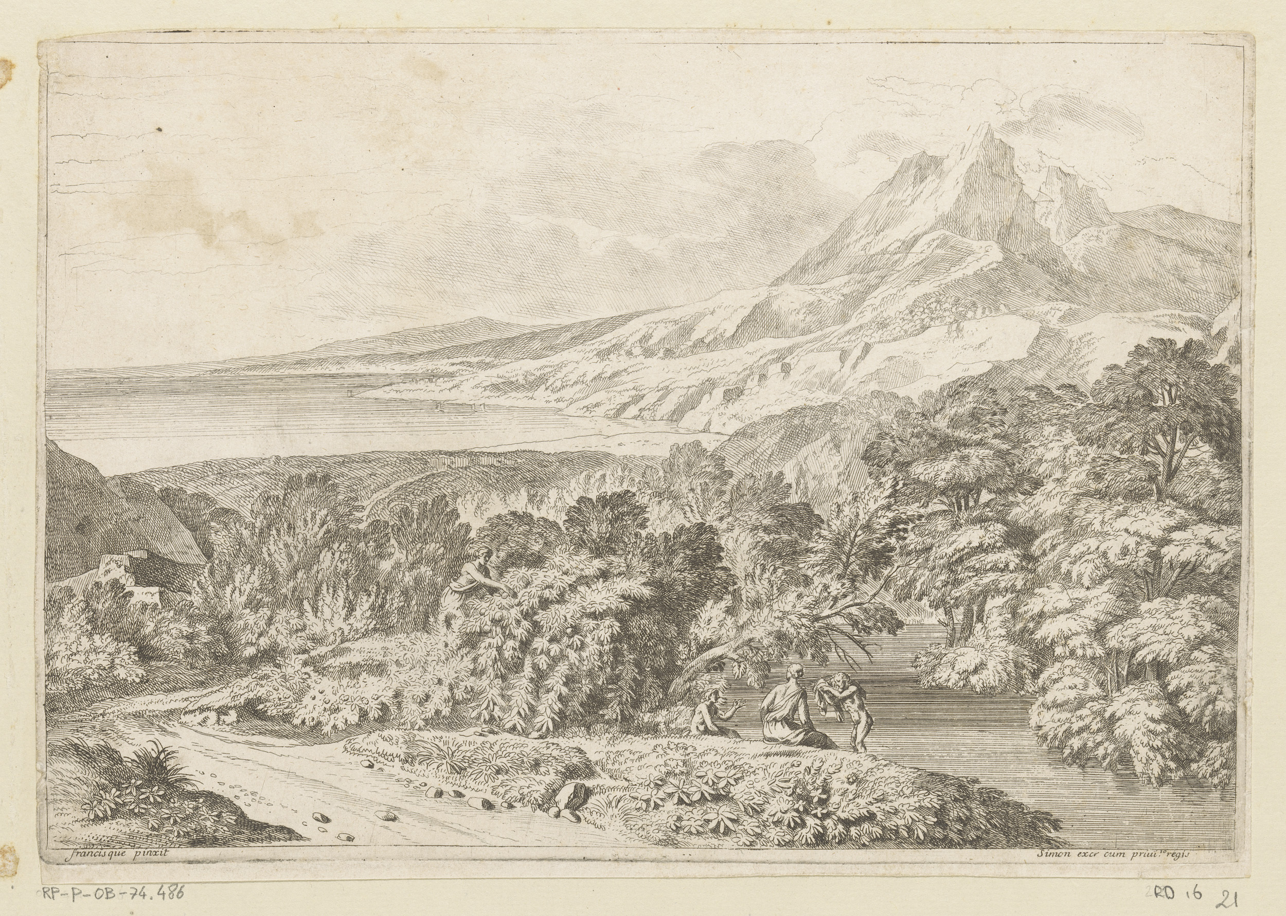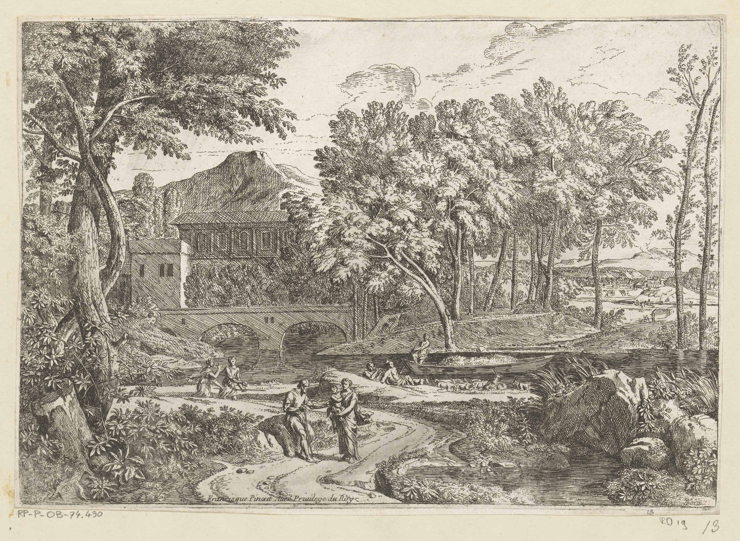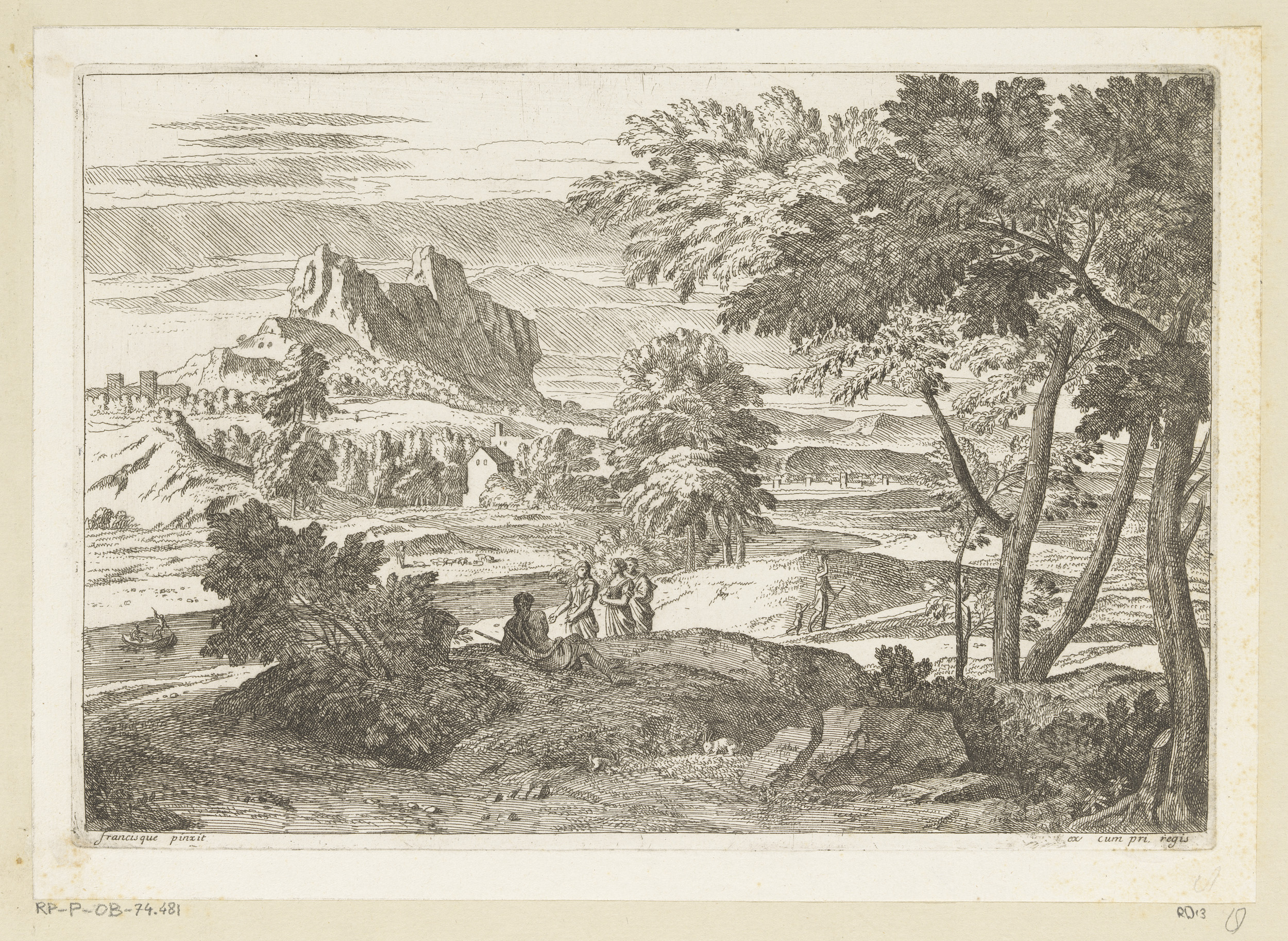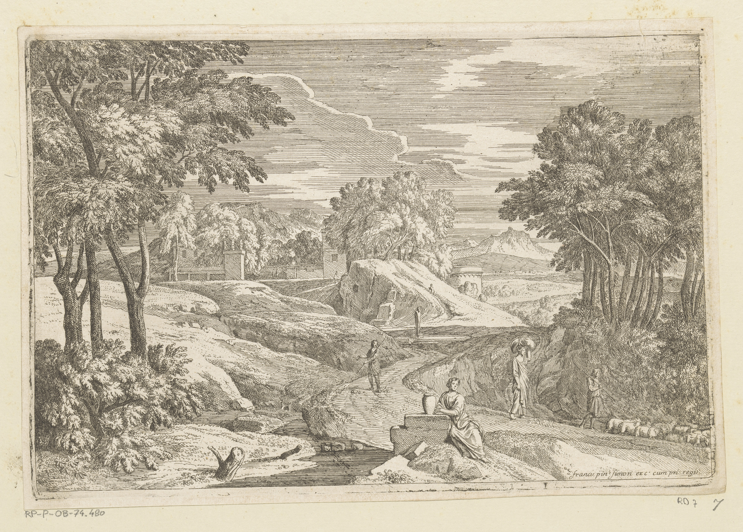 Arcadisch landschap met figuren en konijnen