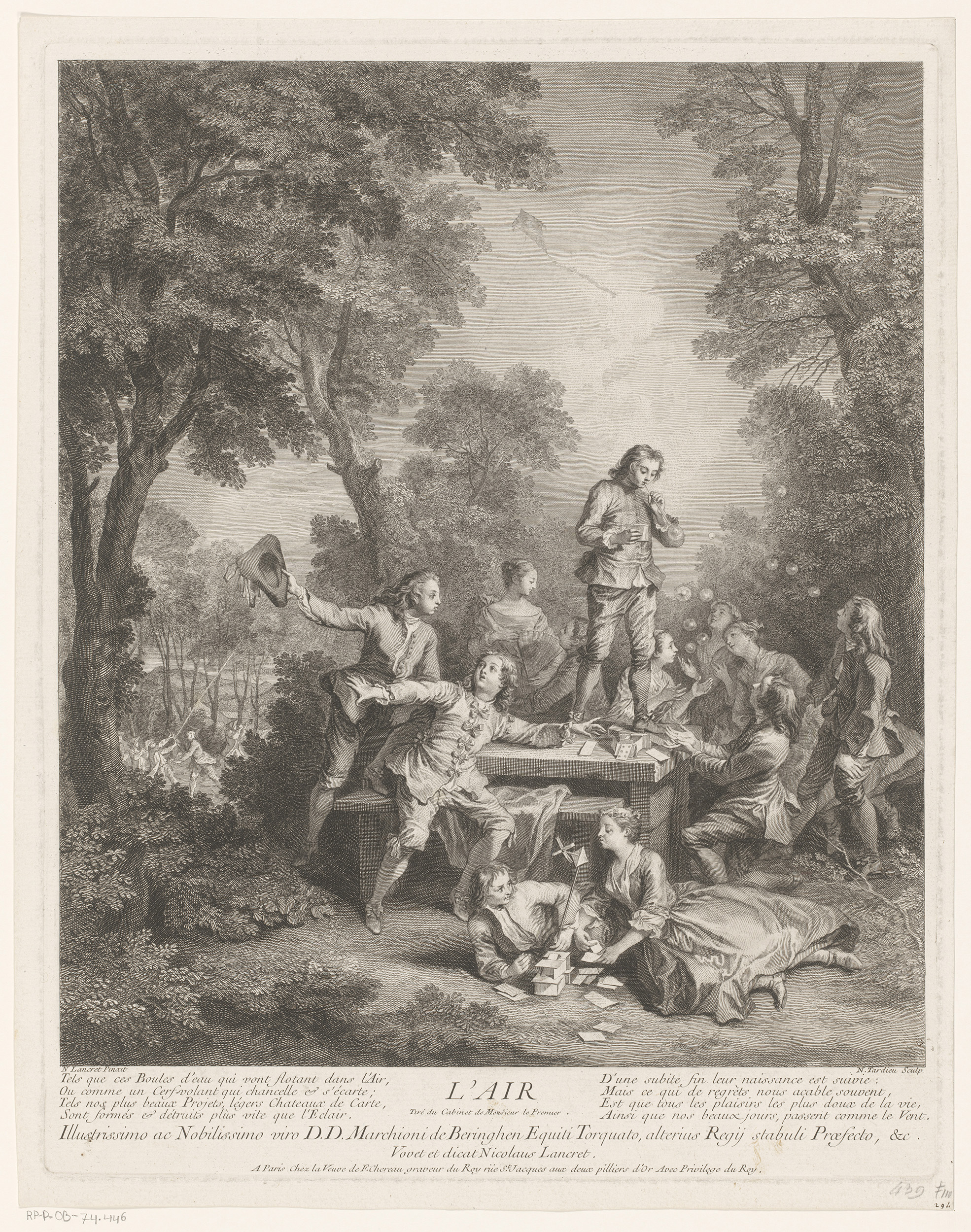 Galant gezelschap aan het vliegeren en bellenblazen:...