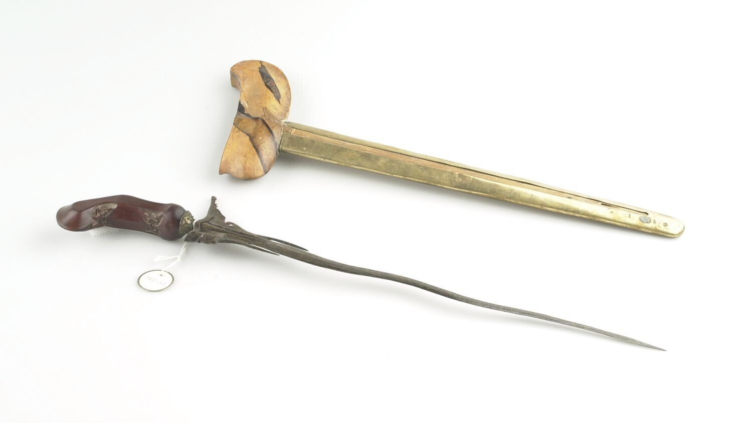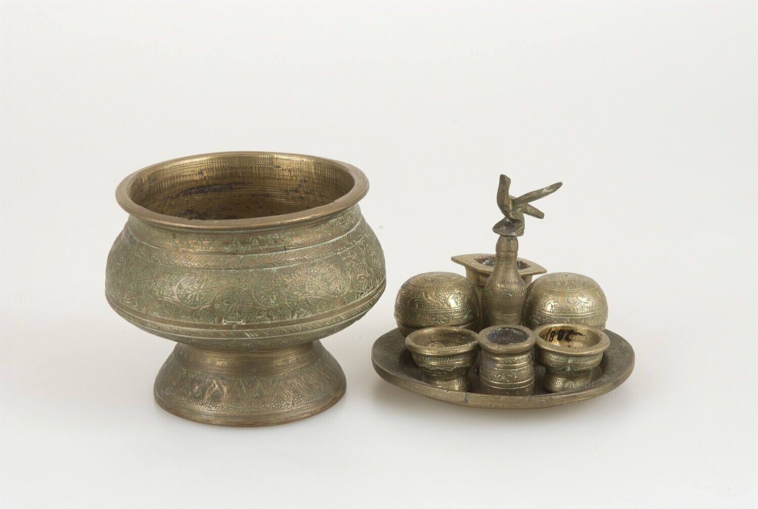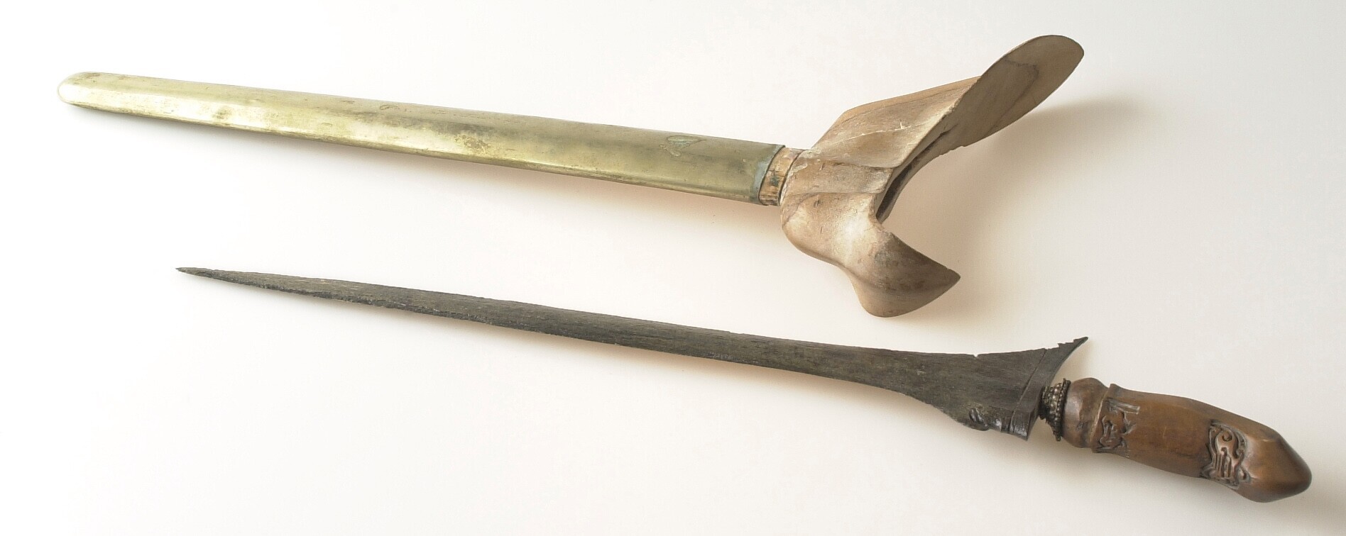 Tweedelig stempel in wayangvorm van blauwgrijze tufs...