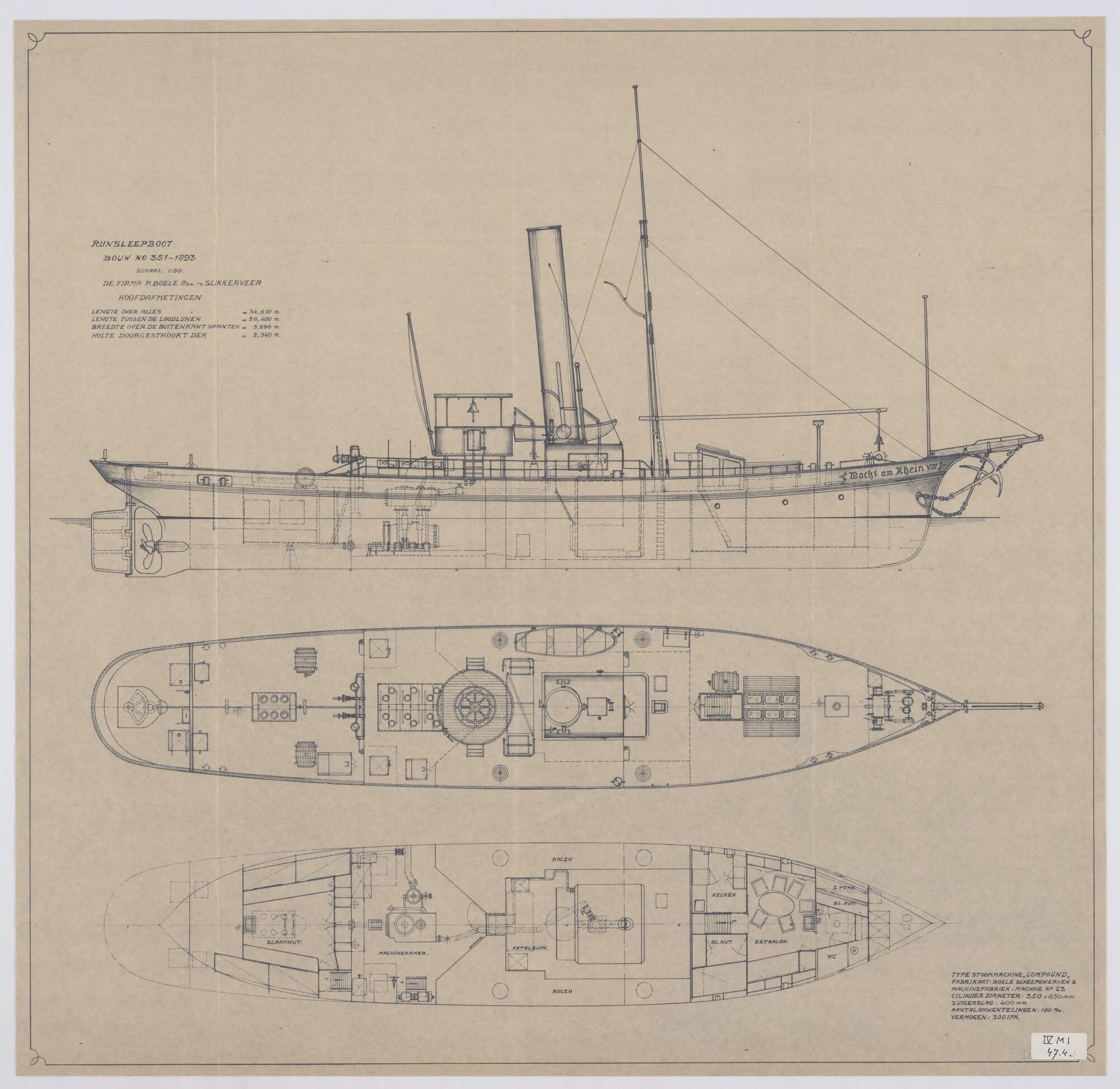 Zijaanzicht en bovenaanzicht van de stoomsleepboot P...