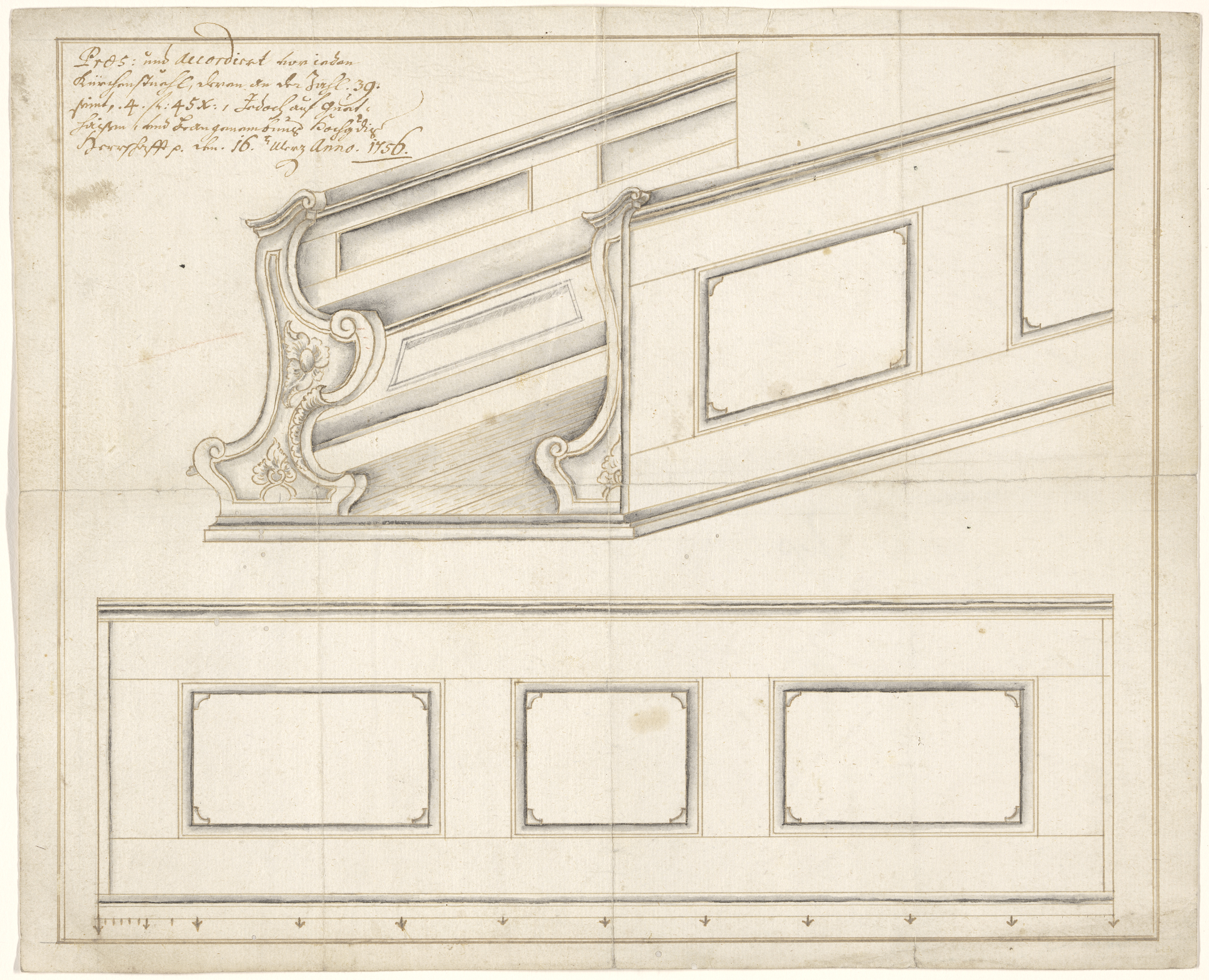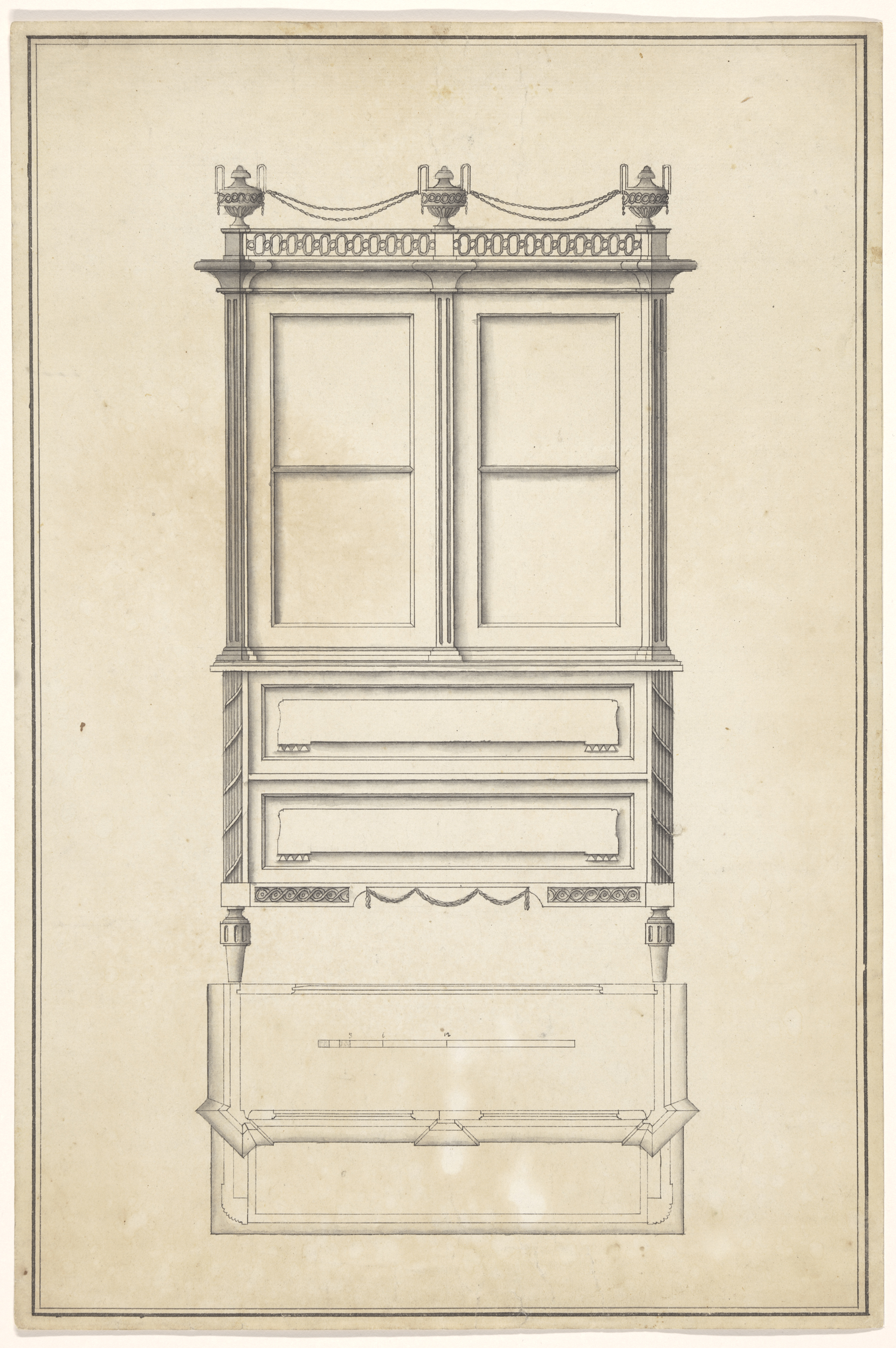 Ontwerp voor twee hoekkasten, met daaronder plattegr...