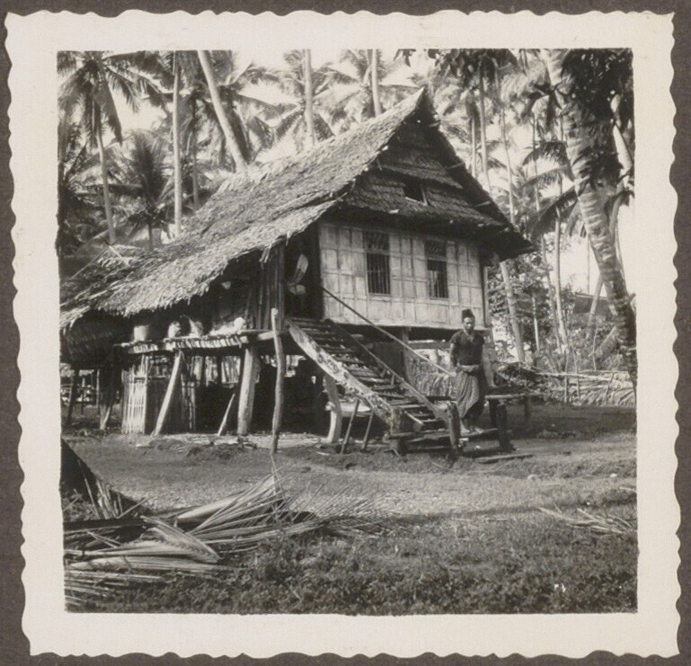 Een man voor zijn paalwoning in Makassar