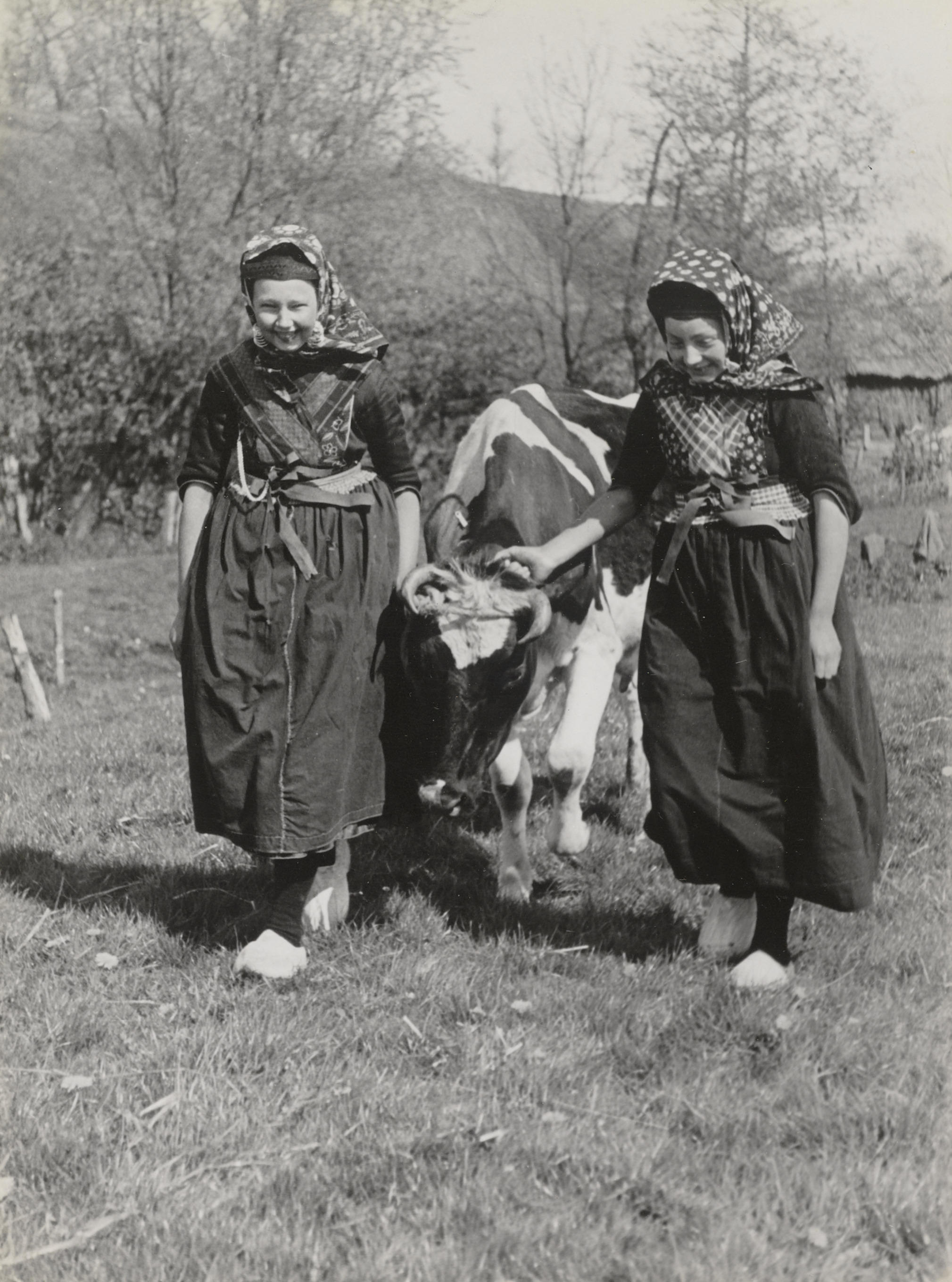 Grietje Troost en Geertje Hoeve met een koe, Rouveen...
