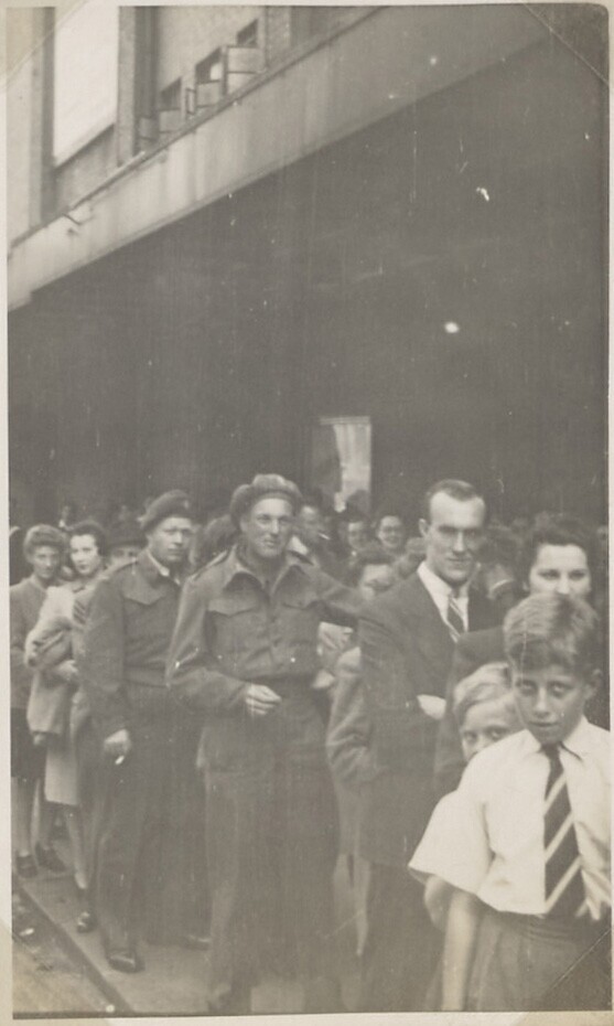 Nederlandse militairen in de rij voor de bios met Gl...