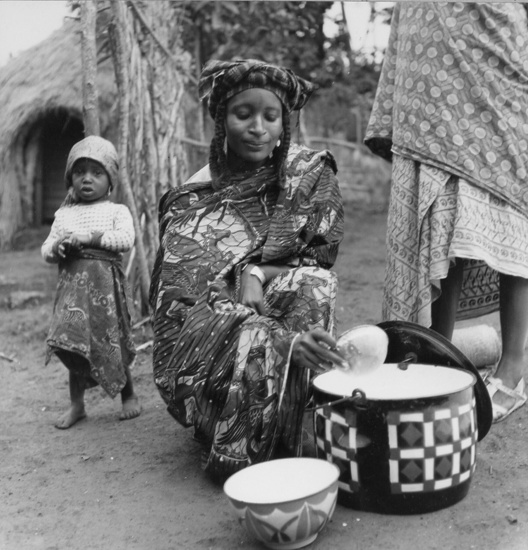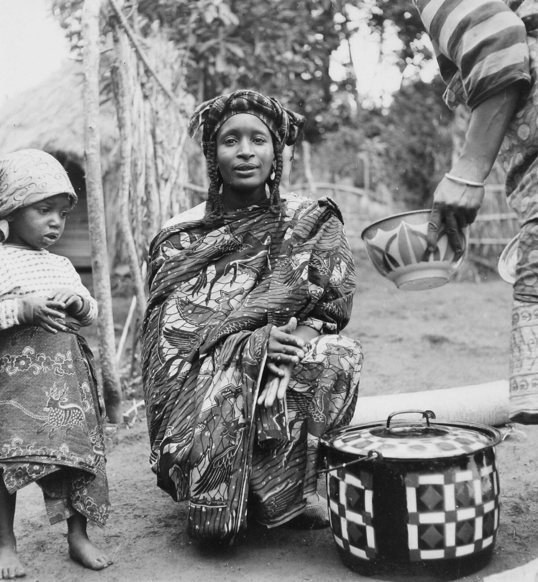 Een Fulani vrouw verkoopt melk uit een pan