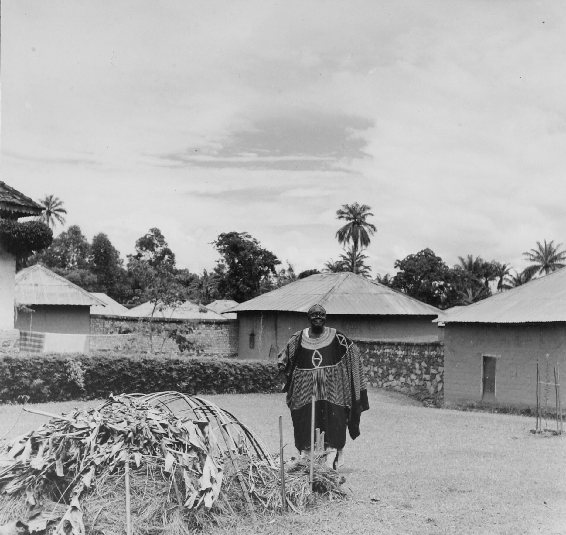 De Fon van Bafut poseert bij de mierenval op zijn erf