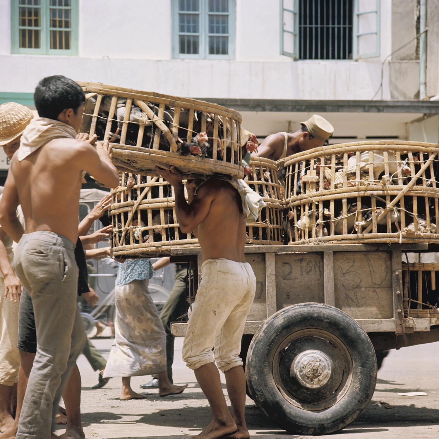 Transport van hanen in manden