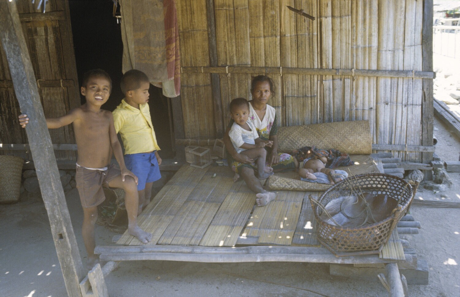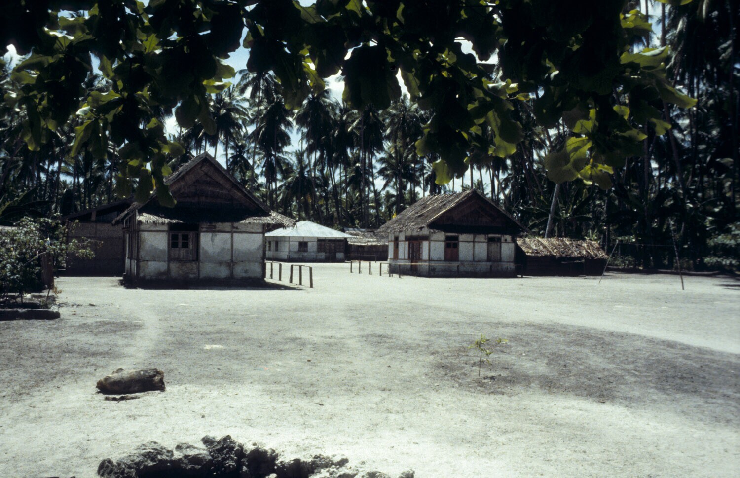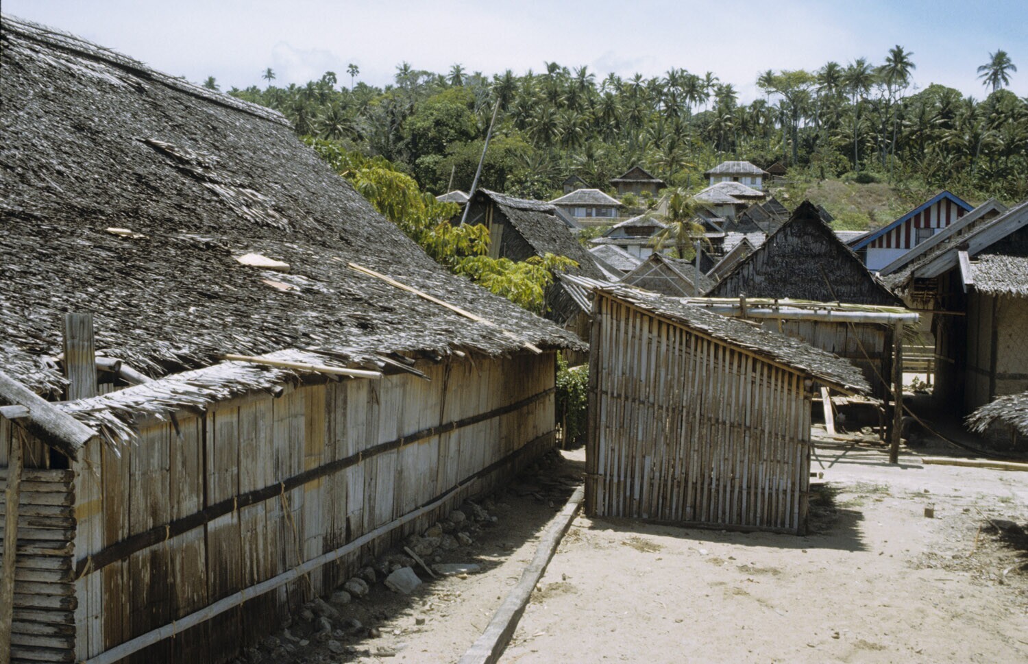 Dorpswoningen in Lorulun op Tanimbar, Molukken.