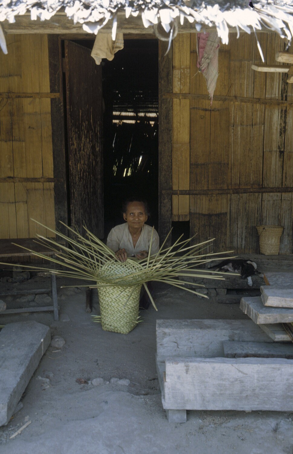 Oude vrouw vlecht een mand, Lorulun op Tanimbar, Mol...