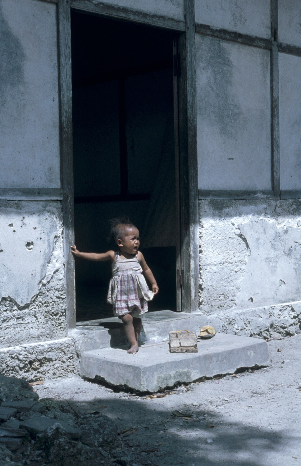 'Klein kind eet ''rujak'', Tual op Kei, Molukken.'