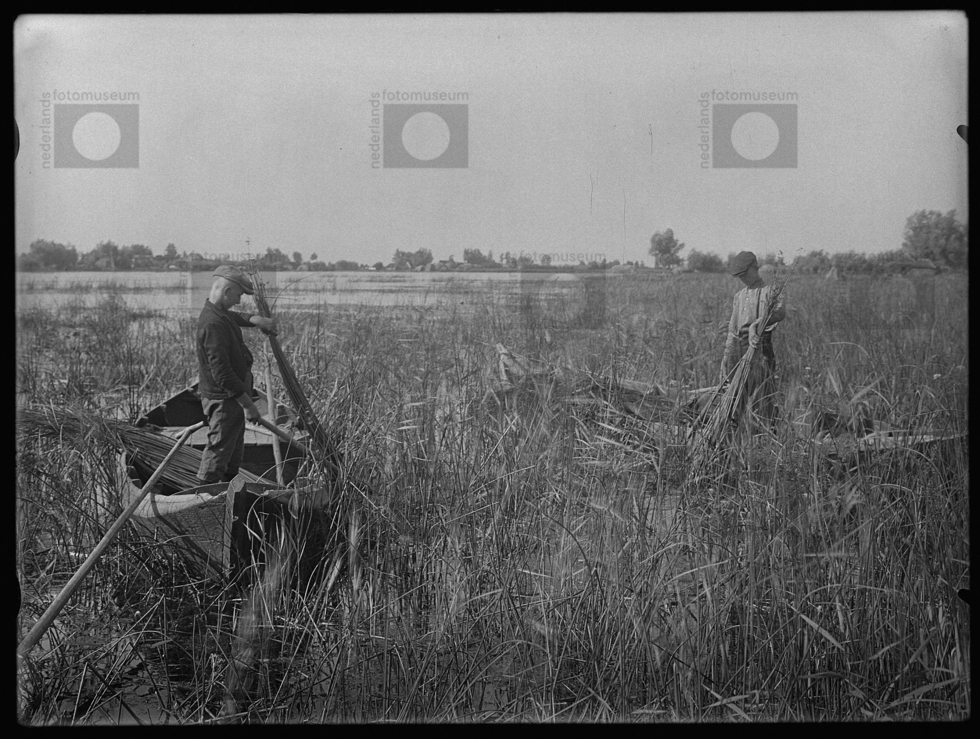 Zonen Jan en Jacob van Thijs Slagter bezig met bieze...