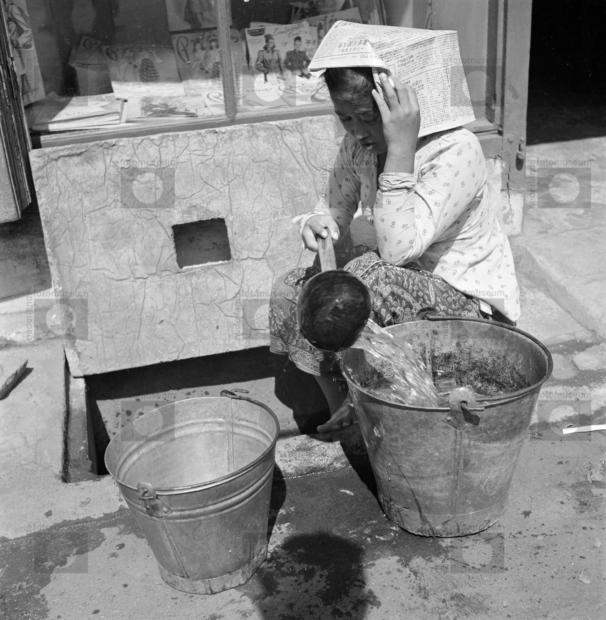 Voor een tijdschriftenkiosk hevelt een vrouw water o...