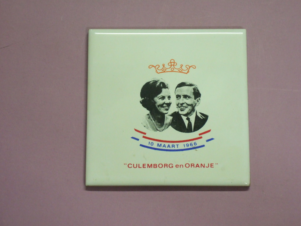 Tegel van witte ceramiek, met portret van Beatrix en...