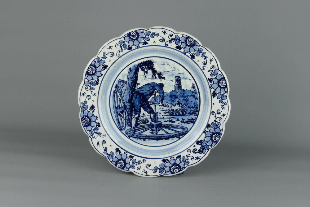 Wandbord van steengoed, blauw gedecoreerd.