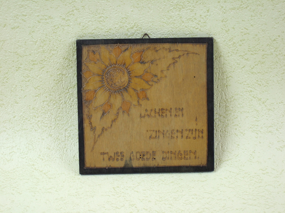 Wandversiering van triplex met bloemmotief en spreuk...