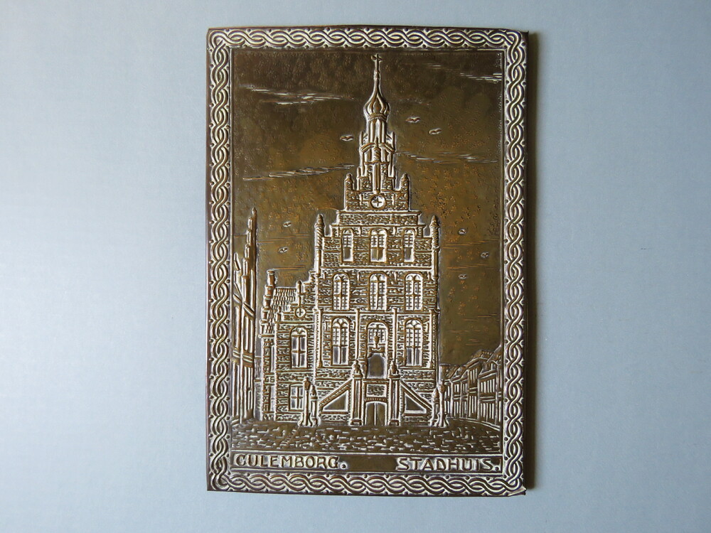wandversiering in koper, voorstellende het stadhuis ...