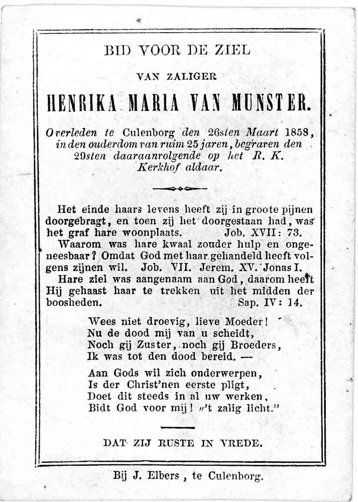 bidprent voor Henrika Maria van Munster. Geboren 183...