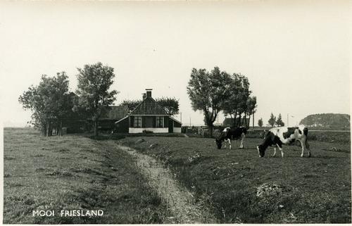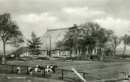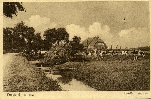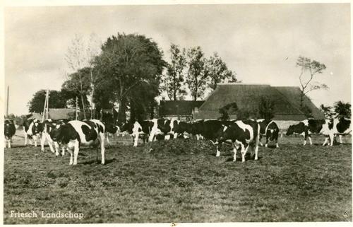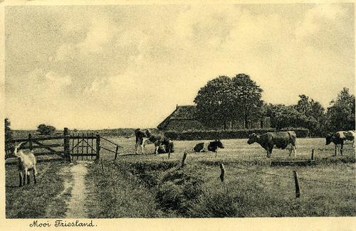 Prentbriefkaart in sepia van een boerderij met koeie...