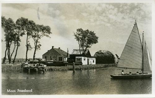 Prentbriefkaart in zwart-wit van een zeilboot in bre...
