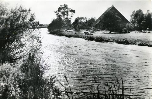 Prentbriefkaart in zwart wit van een boerderij aan b...