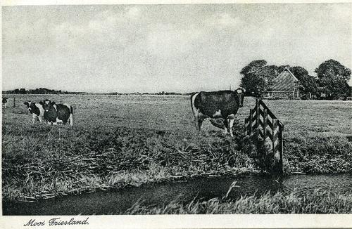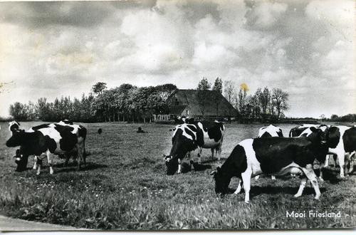 Prentbriefkaart in zwart-wit van grazende koeien in ...