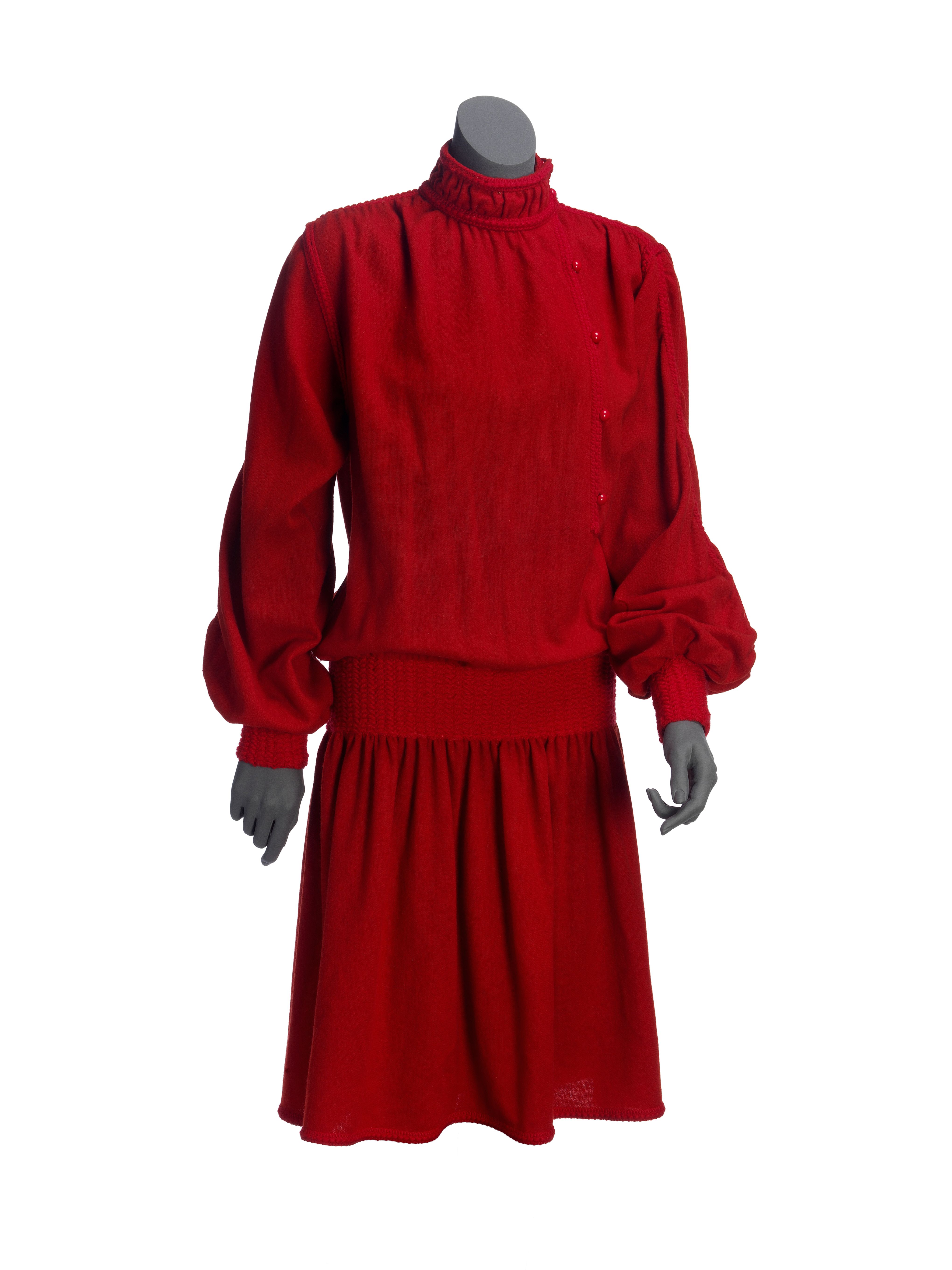 Jurk van rode wol met versiering van gebreide bandje...