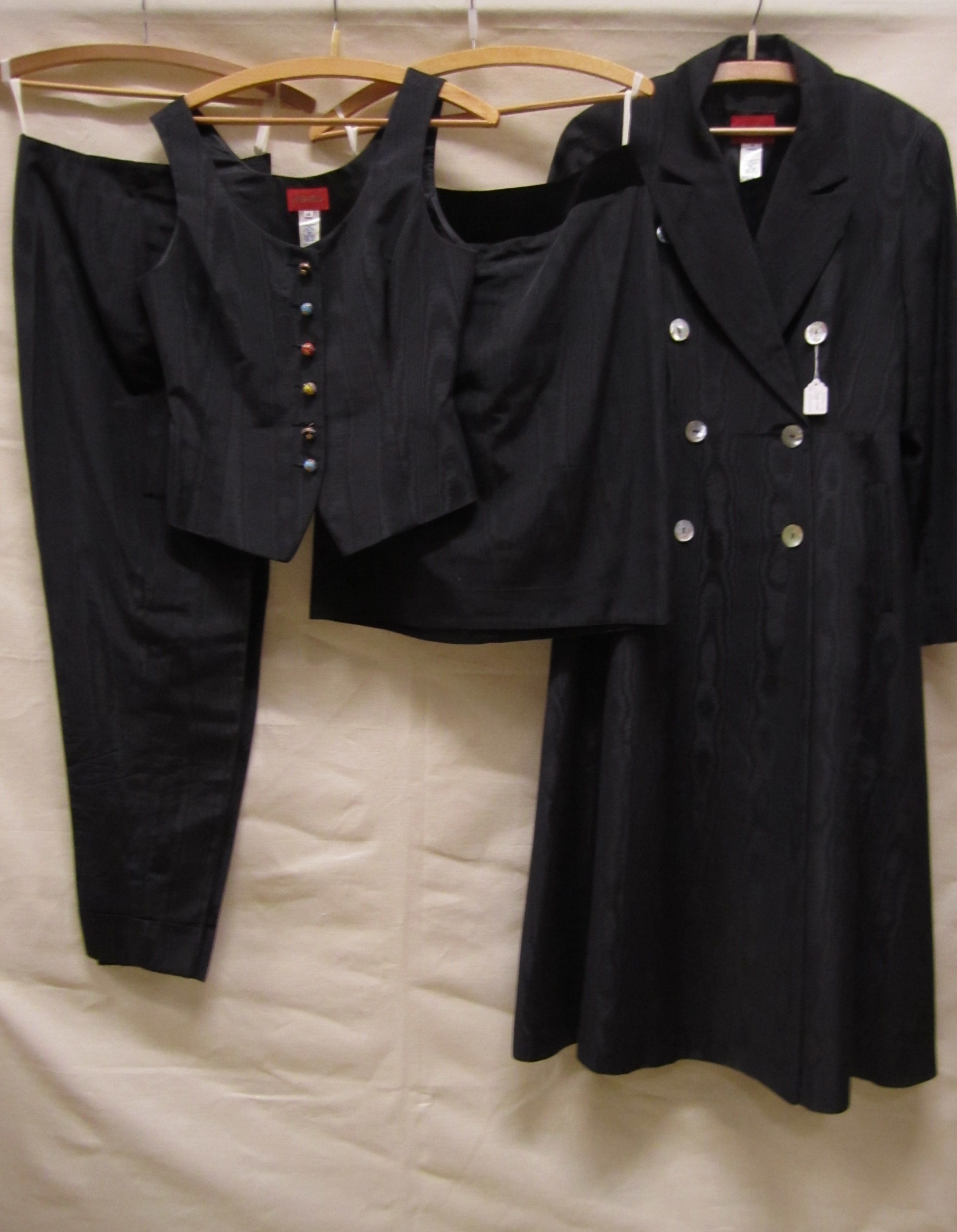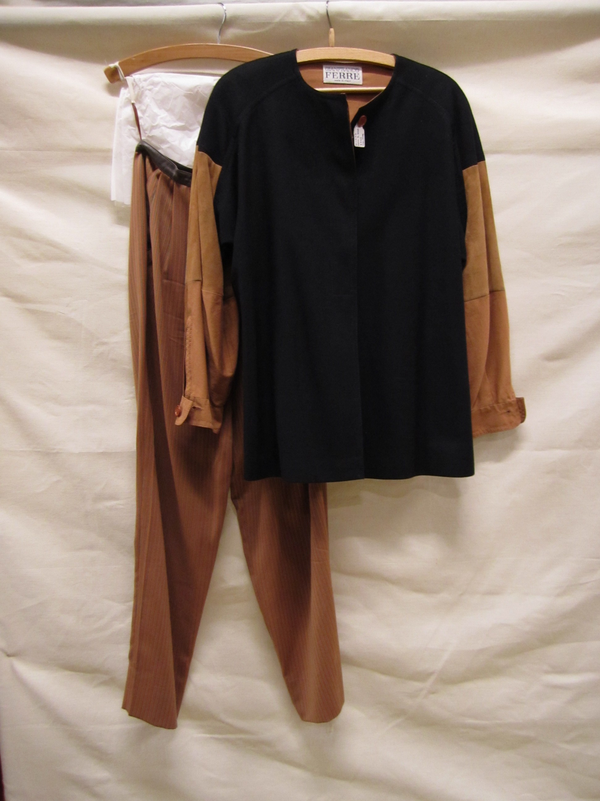 Broekpak, van zwarte en okerkleurige gemengde wol,me...
