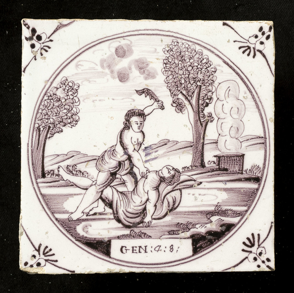 Tegel in tinglazuur, voorstellende gen. 4:8 Kain sla...